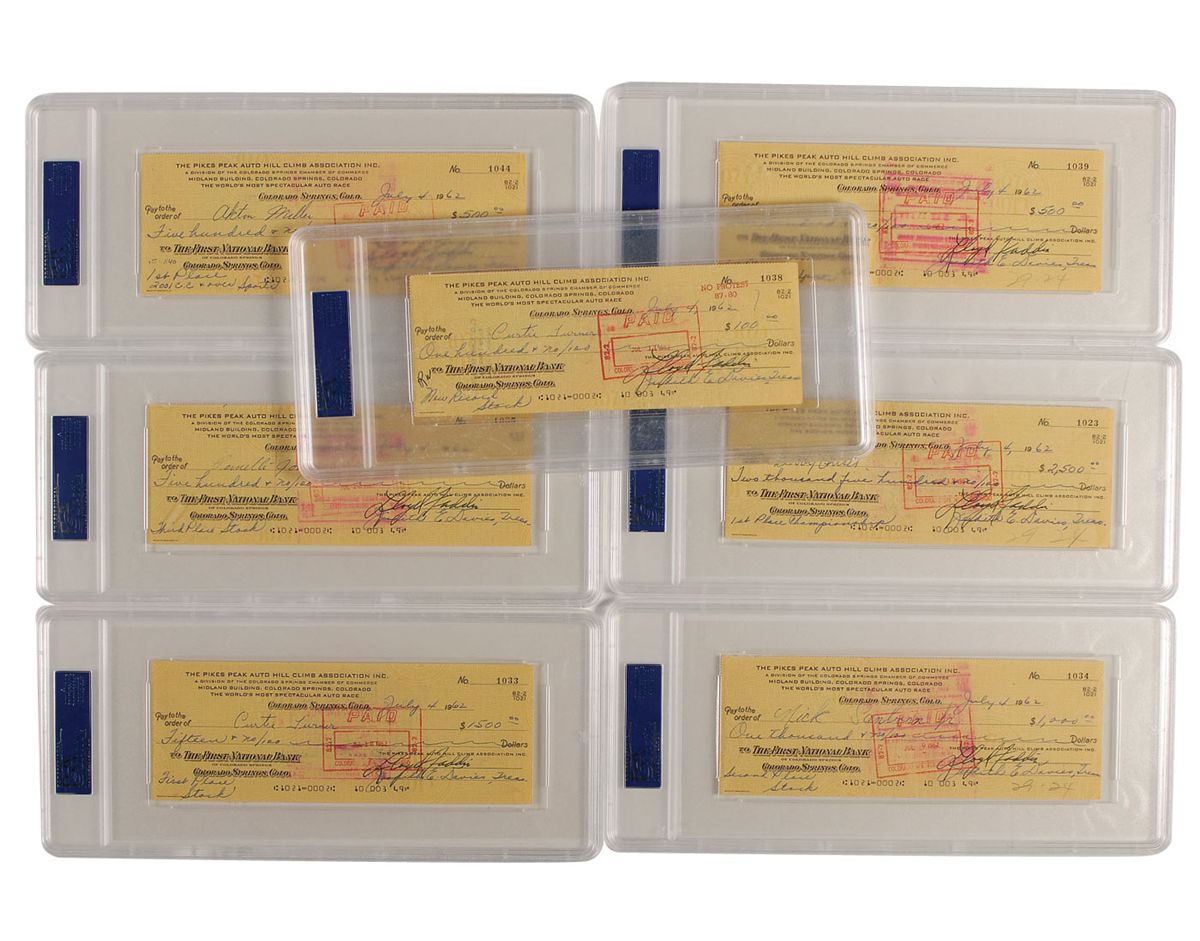 Also known as the Race to the Clouds, this race is an annual automobile and motorcycle hillclimb to the summit of Pikes Peak in Colorado, a distance of 12.42 mi over 156 turns, climbing 4721 feet. Collection of seven Pikes Peak Auto Hill Climb Association Inc. checks, each measuring 8.25 x 3, all dated July 4, 1962, filled out and signed in an unknown hand, and each endorsed on the reverse by the check’s recipient, with a notation on the front for the respective payment. Checks are payable to, and endorsed on the reverse by: Curtis Turner ($100 for New Record Stock), Curtis Turner ($1500 for First Place Stock), Nick Sanborn, Jr. ($1000 for Second Place Stock), Bobby Unser ($2500 1st Place Championship), Akton Miller ($500 1st Place 2001 C.C. & Over Sports), Robert Donner, Jr. ($500 1st Place 0–2000 C.C. Sports), and Parnell Jones ($500 Third Place Stock). Each check is encapsulated in an individual plastic PSA/DNA authentication holder. Vertical folds to a couple of checks, a bank stamp to the body of each, a few pencil or ink notations, otherwise fine condition.