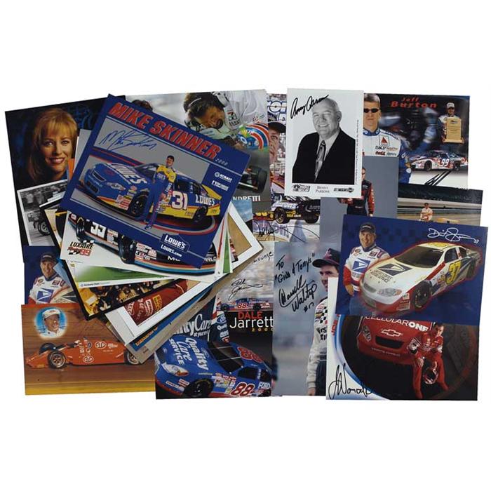 Thirty-four signed photos, ranging in size from 5 x 7 up to 10 x 8, each signed in ink or felt tip by the respective racer pictured. Signers include: Dale Jarrett (ins), Darrell Waltrip (ins), Joe Nemechek, Al Unser, Jr. (2), A. J. Foyt, J. J. Yelley (2), Johnny Rutherford (2 ins), Rick Mears, Mike Skinner, Randy Lajoie, Parnelli Jones, Ricky Craven, Michael Andretti, Jeff Burton, Michael Waltrip, Bobby Allison, Benny Parsons (2), Danny Sullivan, and Tom Sneva (2). In fine overall condition. RRAuction COA.