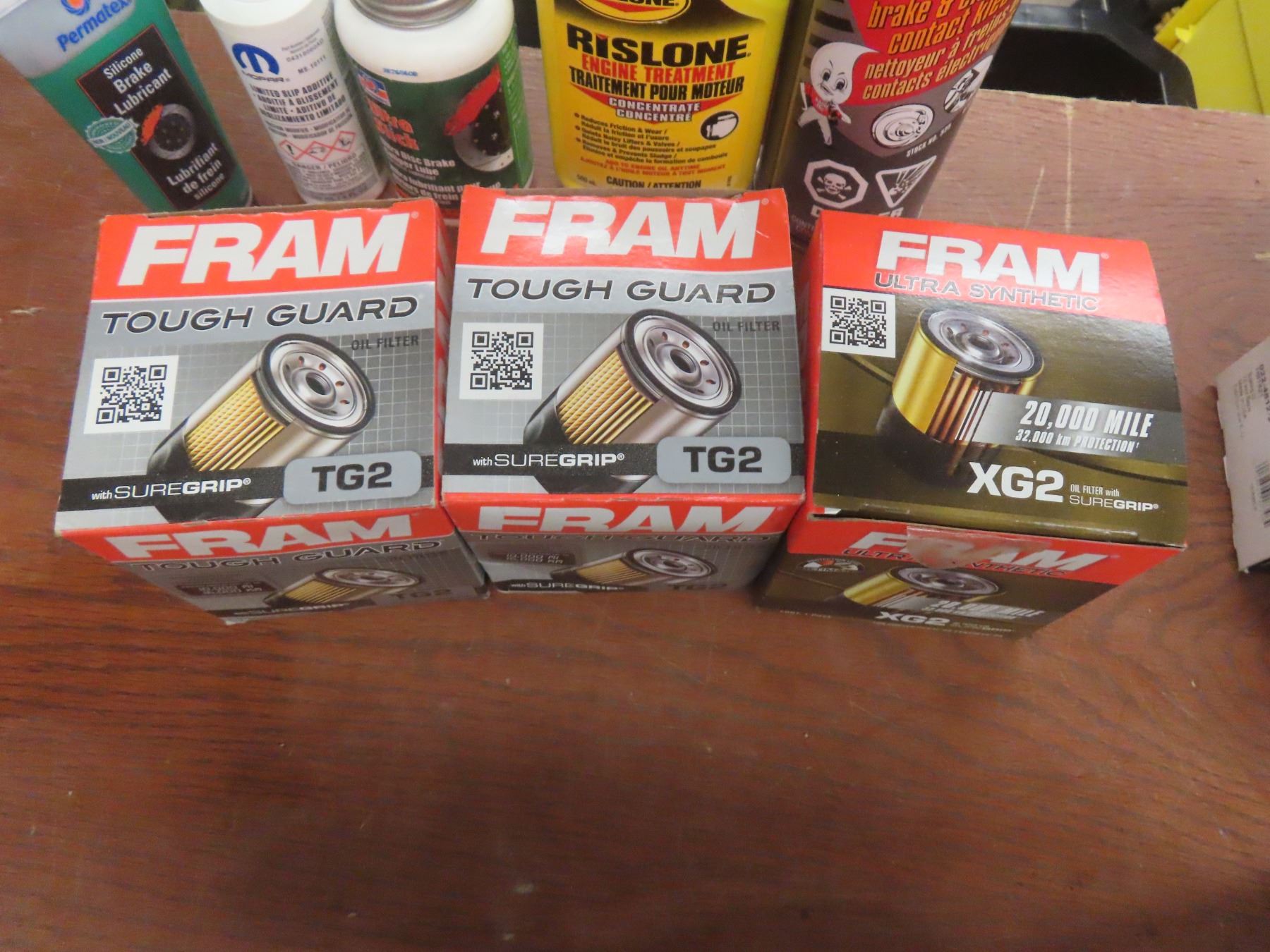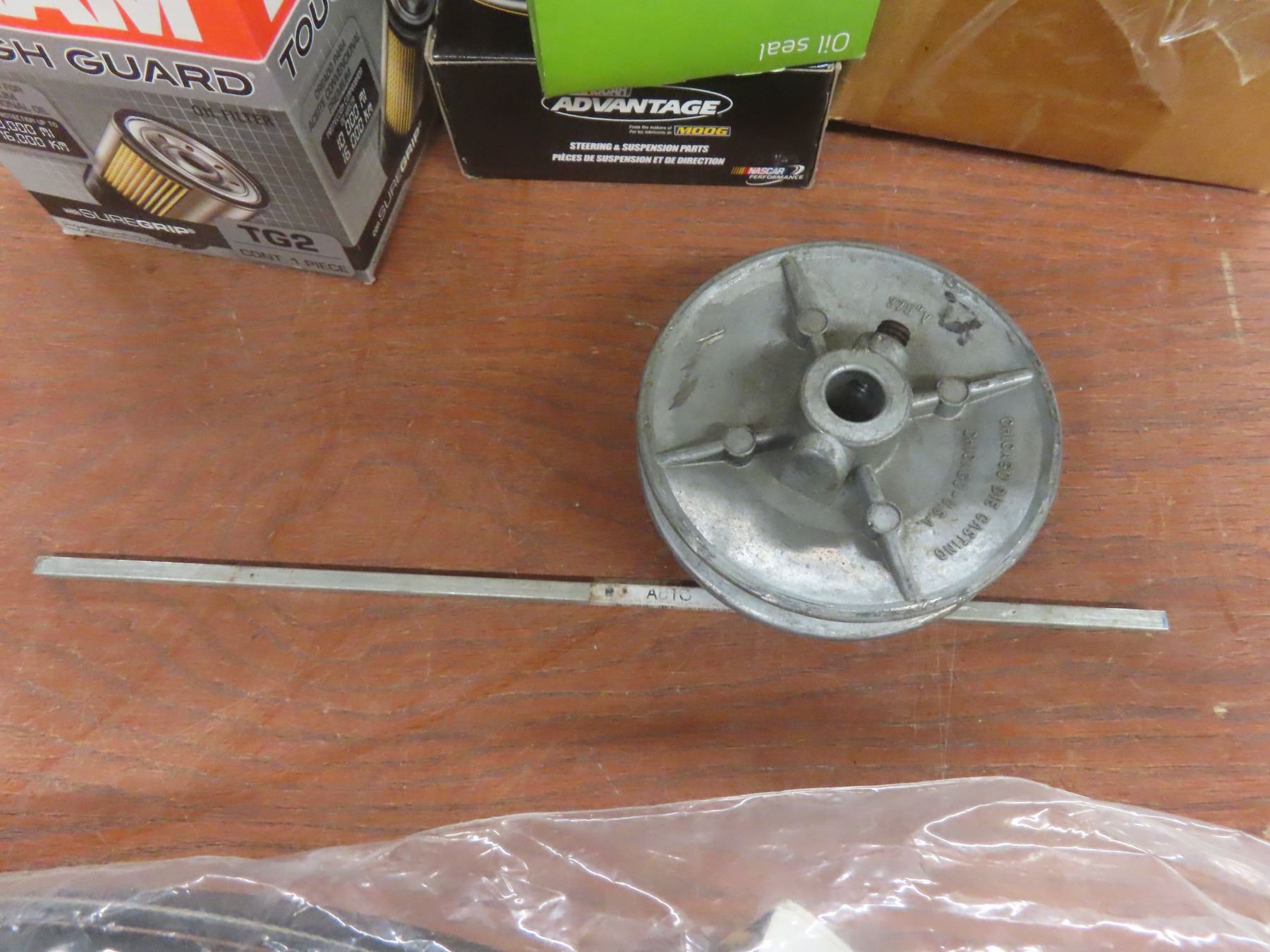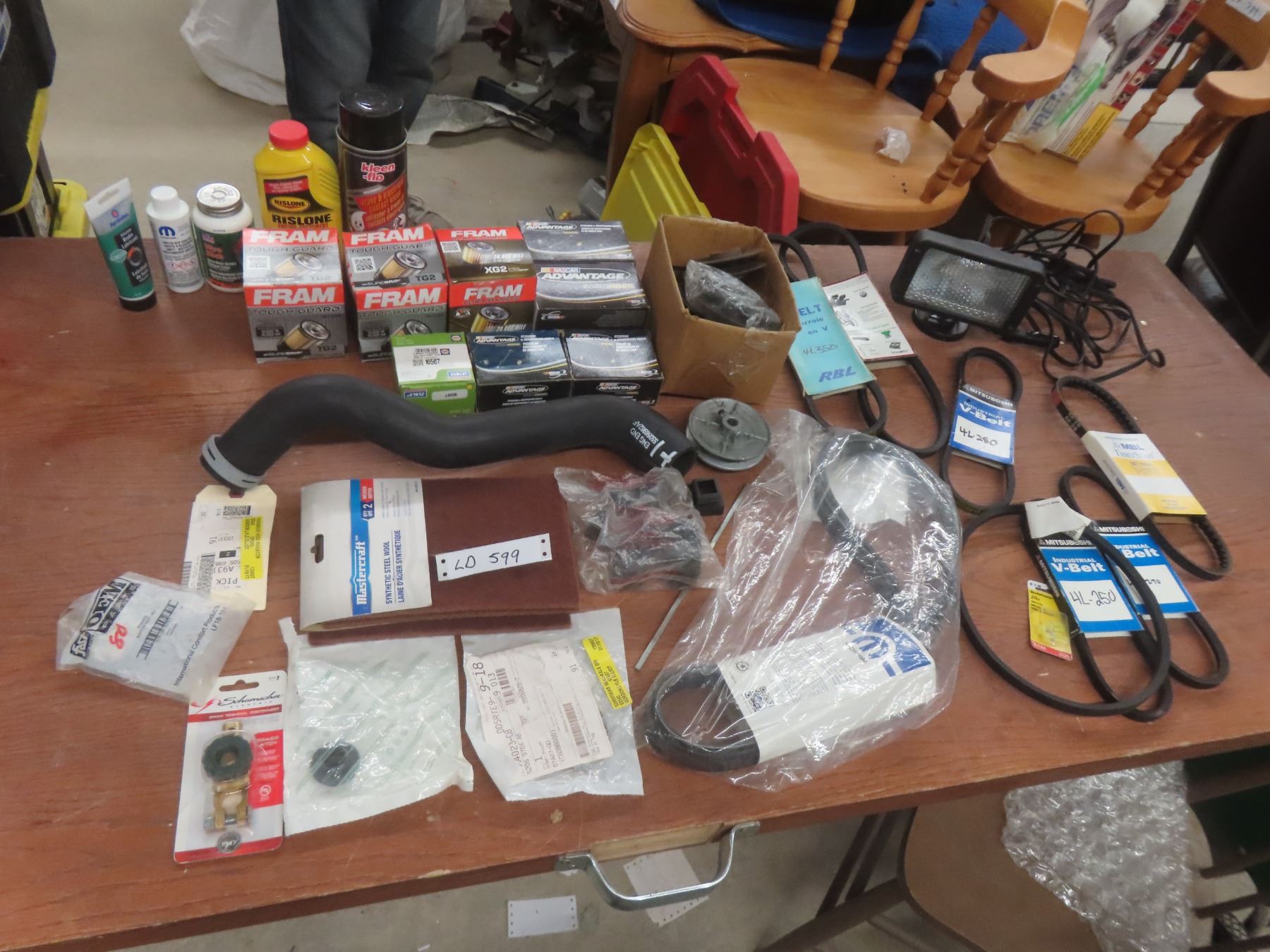 Auto Supplies Including New V-Belts, Steering and Suspension Parts, Fram Oil Filters, Rad Hose, and
