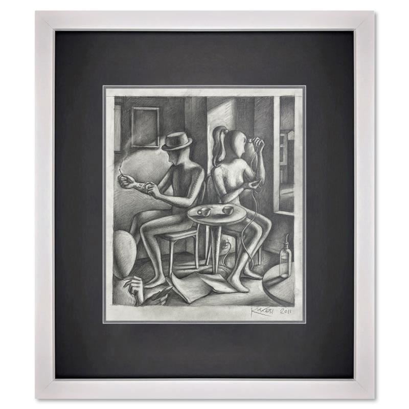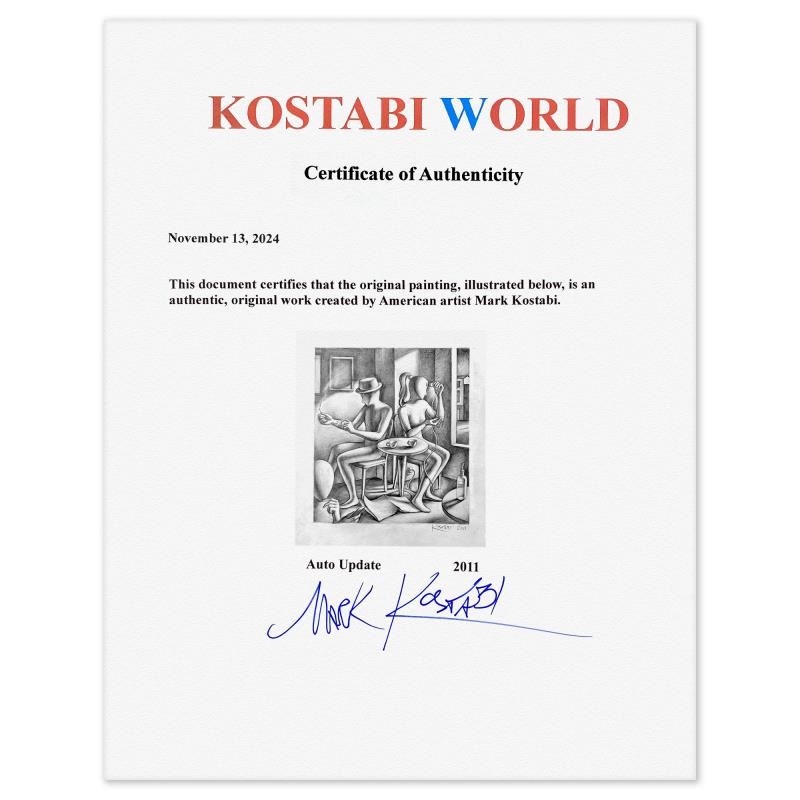 "Auto Update" is an original drawing on paper by Mark Kostabi, hand signed by the artist. This piece comes custom framed. Includes Certificate of Authenticity. Measures approx. 21" x 19.5" (frame), 13.5" x 11" (image). This item requires special handling and may have a longer than usual turnaround.