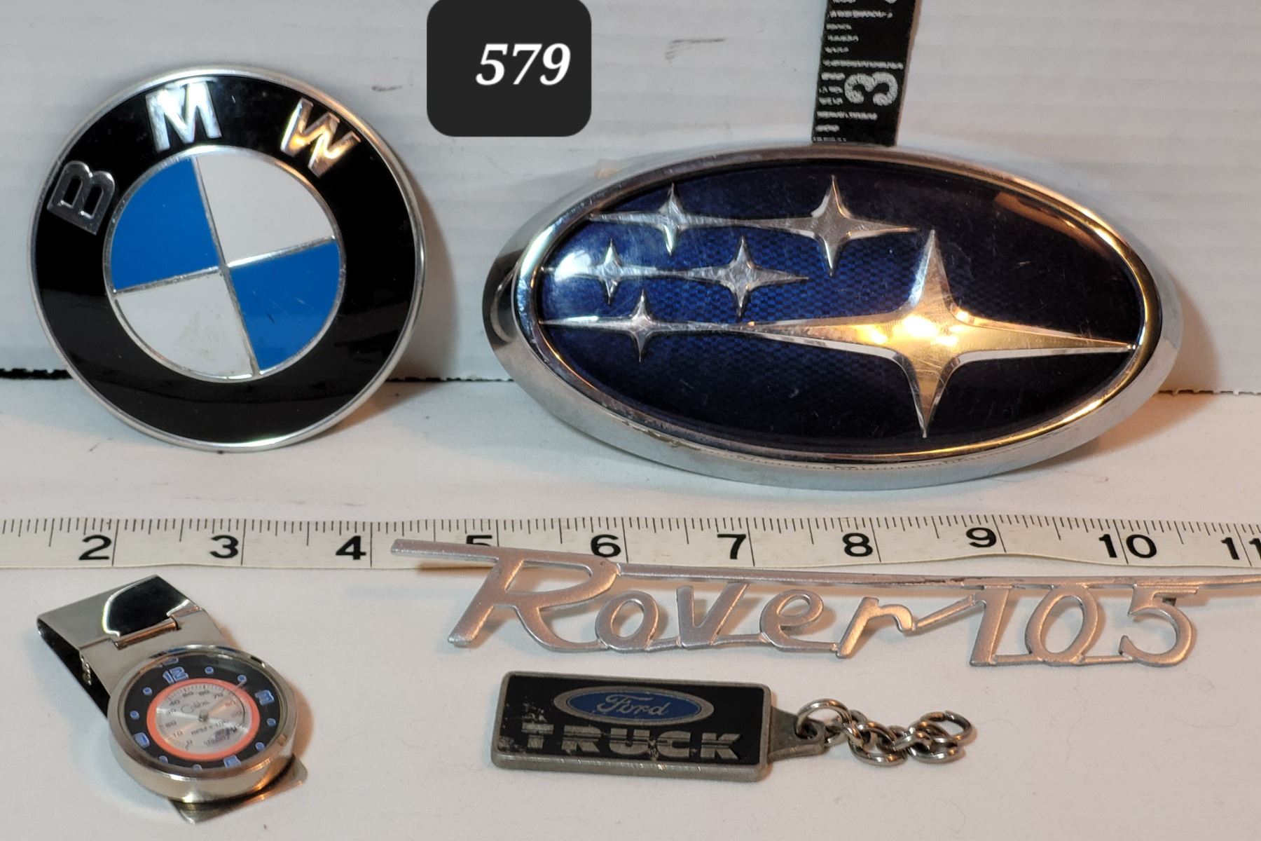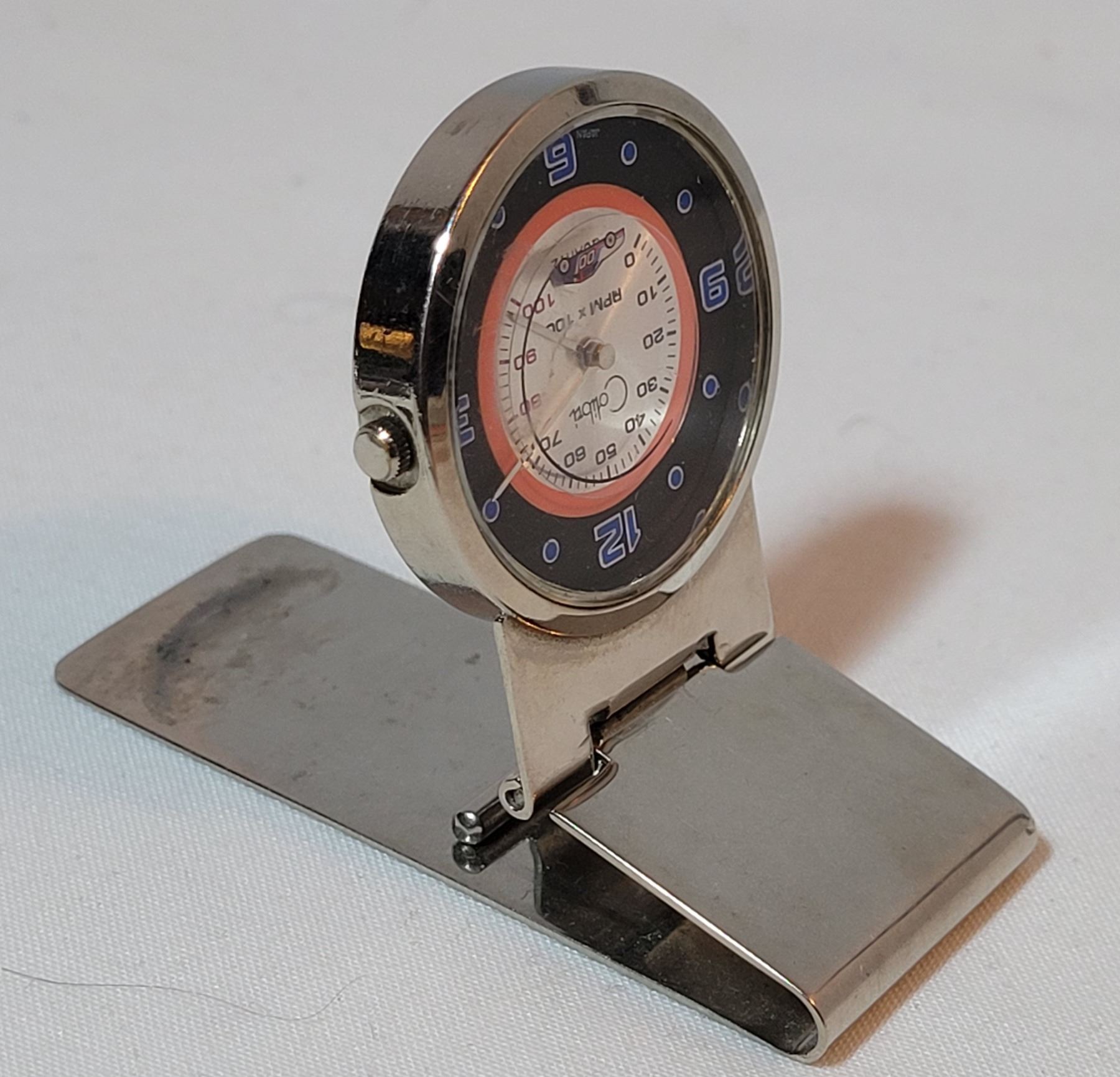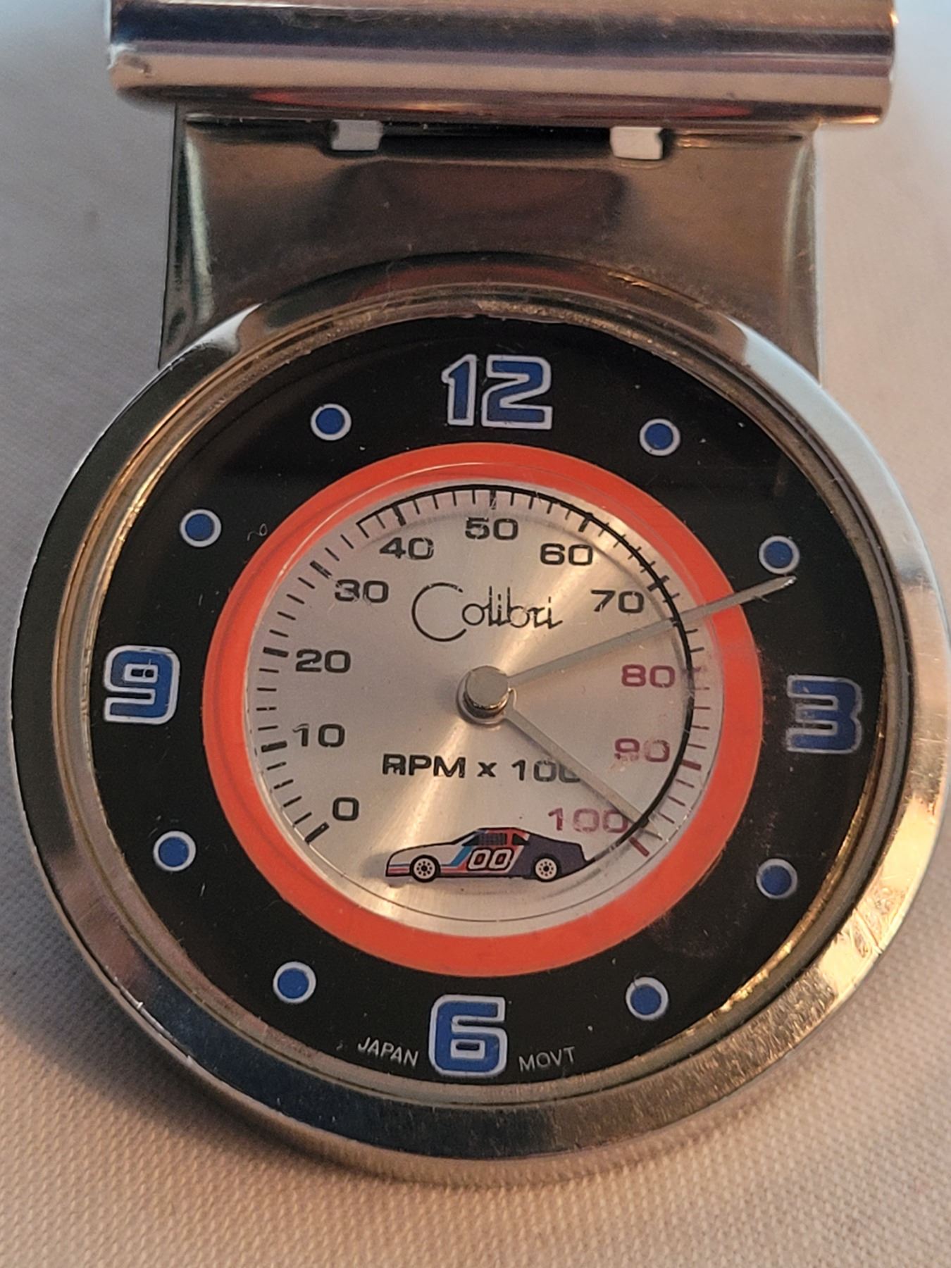 Auto emblems & money clip with car moving around the face. Japan movement.
