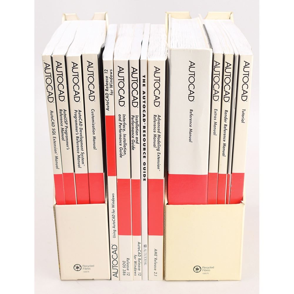 Collection of manuals, reference books, and floppy disks for Autodesk's AutoCAD (Release 12), including: installation and performance guides; fundamental tools; advanced tools; and the Autocad Advanced Modeling Extension (AME). In very good to fine condition, with some surface loss and felt tip notations to the slipcases.