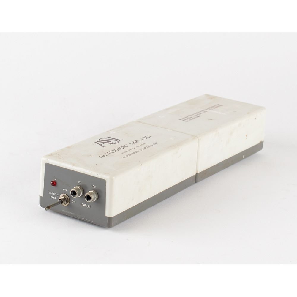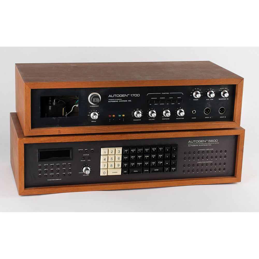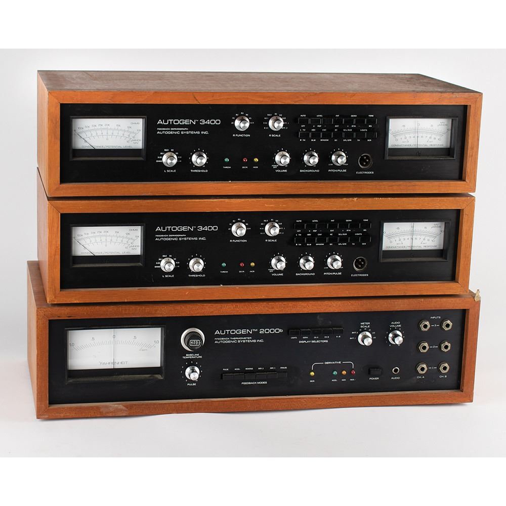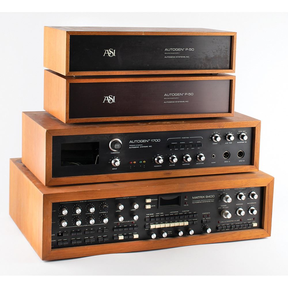 Large biofeedback monitoring system built by Autogenic Systems, Inc., designed for guided hypnosis and relaxation sessions, similar to a polygraph test. Includes an Autogen MA-30 AC/DC optical isolator, two Autogen P-50 isolated power supplies, two Autogen 1700 feedback myographs, a Matrix 9400 multi-channel composite coordinator, an Autogen 5600 computing multi-channel data acquisition center, two Autogen 3400 feedback dermographs, an Autogen 2000b feedback thermometer, and several 15000 optically-isolated converters. In overall very good to fine condition.