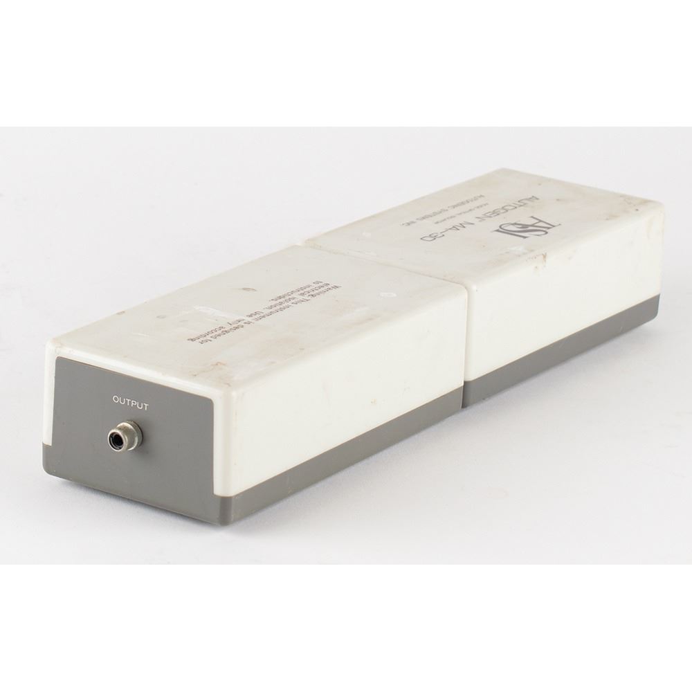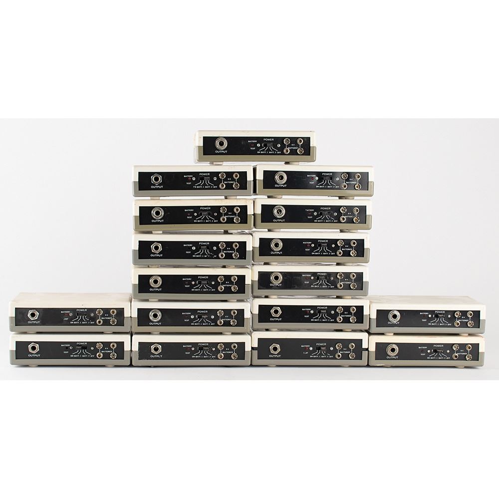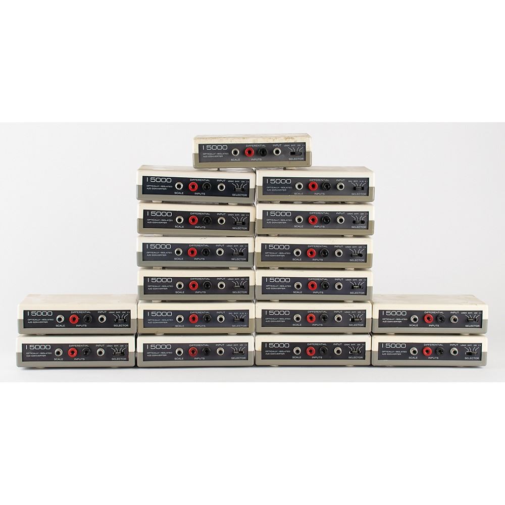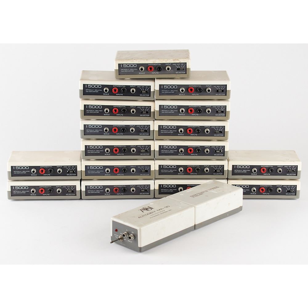 Large biofeedback monitoring system built by Autogenic Systems, Inc., designed for guided hypnosis and relaxation sessions, similar to a polygraph test. Includes an Autogen MA-30 AC/DC optical isolator, two Autogen P-50 isolated power supplies, two Autogen 1700 feedback myographs, a Matrix 9400 multi-channel composite coordinator, an Autogen 5600 computing multi-channel data acquisition center, two Autogen 3400 feedback dermographs, an Autogen 2000b feedback thermometer, and several 15000 optically-isolated converters. In overall very good to fine condition.