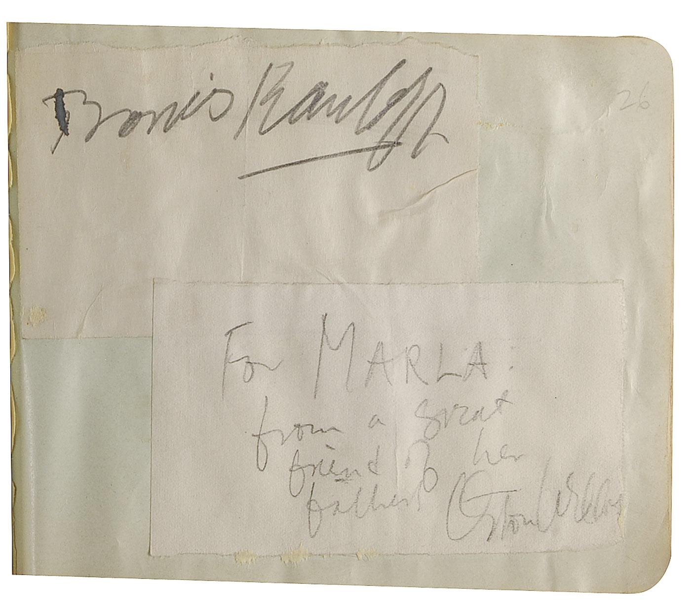 Softcover autograph album, 6 x 5, signed inside in pencil or ink in the 1930s by 146 celebrities. Nearly all signatures are cut and affixed to their respective page, with several pages having two signatures affixed, the majority are inscribed. Signers include: Bud Abbott and Lou Costello, Bela Lugosi, Boris Karloff, Peter Lorre, Basil Rathbone, Vincent Price, Alan Ladd, Veronica Lake, Orson Welles, Frank Sinatra, Irving Berlin, Lucille Ball, Errol Flynn, Tyrone Power, Marlene Dietrich, Gloria Swanson, Mary Pickford, Cary Grant, Bert Lahr, Frank Morgan, Jack Haley, Billie Burke, Fredric March and Florence Eldredge, Susan Hayward, Dick Powell, William Bendix, Rosalind Russell, Red Skelton, Jack Benny and Mary Livingstone, Rochester, Betty Grable, Bing Crosby, Charles Coburn, Burgess Meredith, Milton Berle, Paulette Goddard, Brian Donlevy, Dorothy Lamour, Lena Horne, Raymond Massey, Andy Devine, Walter Pidgeon, Robert Young, Kate Smith, Gene Autry, Walter Huston, Edward G. Robinson, James Cagney, John Barrymore, Gary Cooper, Tallulah Bankhead, Laird Cregar, Eddie Cantor, Joan Bennett, Joan Blondell, Zasu Pitts, Rex Harrison, Ed Wynn, Carmen Miranda, Freeman Gosden and Charles Correll, George Raft, and Jimmy Durante. In overall very good condition, with many as noted in pencil, inscribed, irregularly clipped, and pasted to the page. The book was originally owned by Marla Cantor, whose father, Charlie Cantor, was a veteran vaudeville, radio, and television actor. A more complete list is available upon request. A treasure trove of Hollywood’s greatest names!