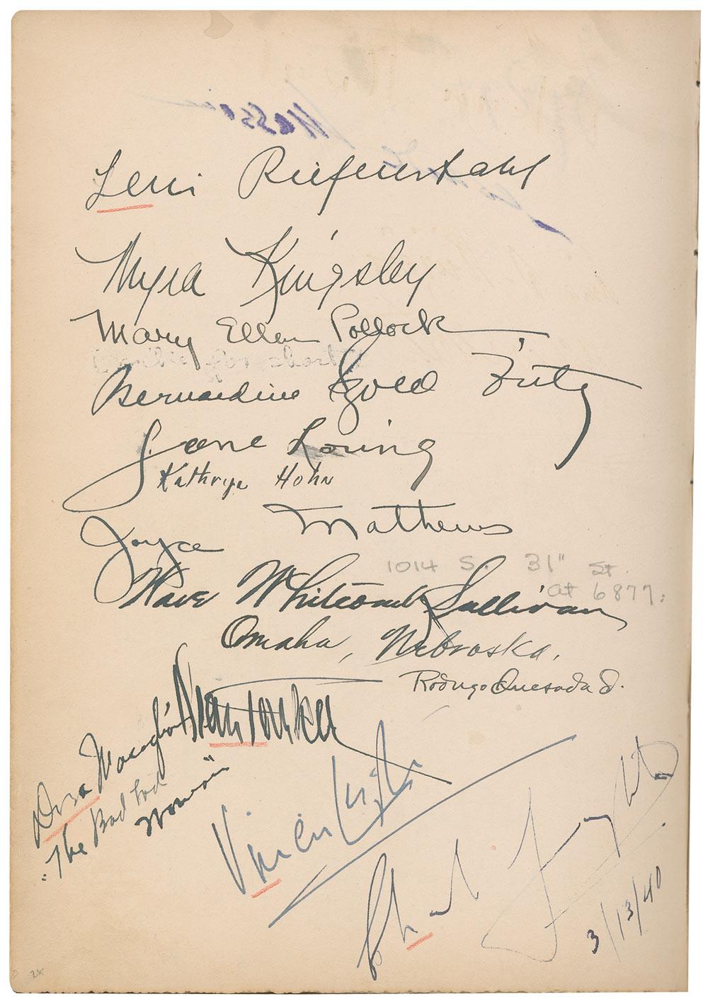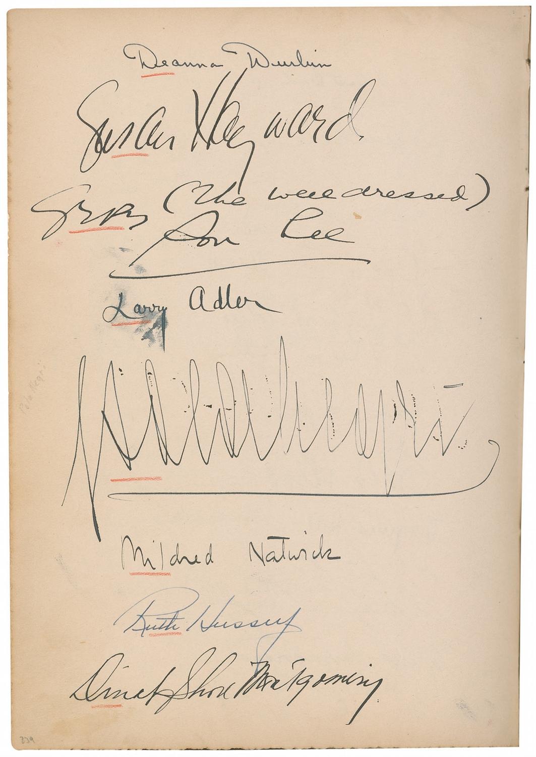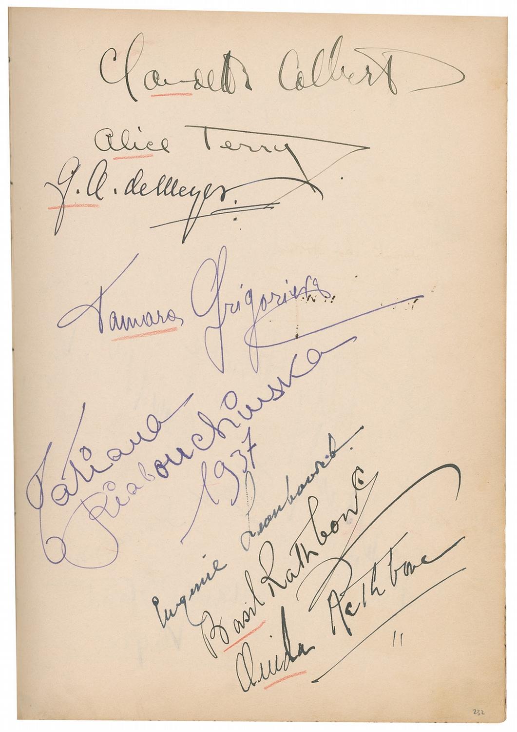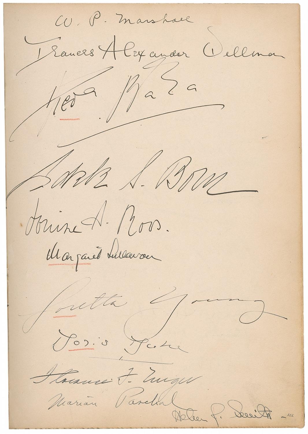 Vintage leather bound hardcover autograph album, 7.5 x 10.25, dating from 1927 to approximately 1947, signed inside by over 450 people, with all pages multi-signed, and back-to-back. Front of book is embossed with the name of Howard Greer, a Hollywood costume designer, as well as the Chief Costume Designer at Paramount from 1924–1927. Signers include: Greta Garbo, Thelma Todd, Harold Lloyd, Mary Pickford, Katharine Hepburn, Basil Rathbone, Vivien Leigh, Charles Laughton, Rita Hayworth, Salvador Dali, Ingrid Bergman, Shirley Temple, Greer Garson, George Bernard Shaw, Billie Burke Ziegfield, Marlene Dietrich, Al Jolson, Frank Capra, Walter Plunkett, Edith Head, Louise Brooks, W[illiam] Randolph Hearst, Marion Davies, Carl Van Vechten, James Montgomery Flagg, Carl Laemmle, Jr., Vilma Banky, Joseph Schildkraut, Paul Bern, Barbara Stanwyck Fay, Helen Kane, Helen Hayes, Norma Shearer, Kay Francis, Cecil Beaton, Fay Wray, Jeanette MacDonald, Anna May Wong, Noel Coward, Gwili Andre, Irene Dunne, Helen Twelvetrees, Elizabeth Arden, Clata Bow, Adrian (Wizard of Oz costumer), Zita Johann, Gracie Allen, Theda Bara, Margaret Sullivan, Doris Duke, Myrna Loy, Claudette Colbert, Tallulah Bankhead, Ginger Rogers, Leni Riefenstahl, Jennifer Jones, Susan Hayward, and Pola Negri. Uniform toning to inside pages, red pencil underlines to beginning of some of the signatures, and light rubbing and wear, including a bit of scattered light surface loss to covers and spine, otherwise fine condition. A more comprehensive list is available for download at rrauction.com.