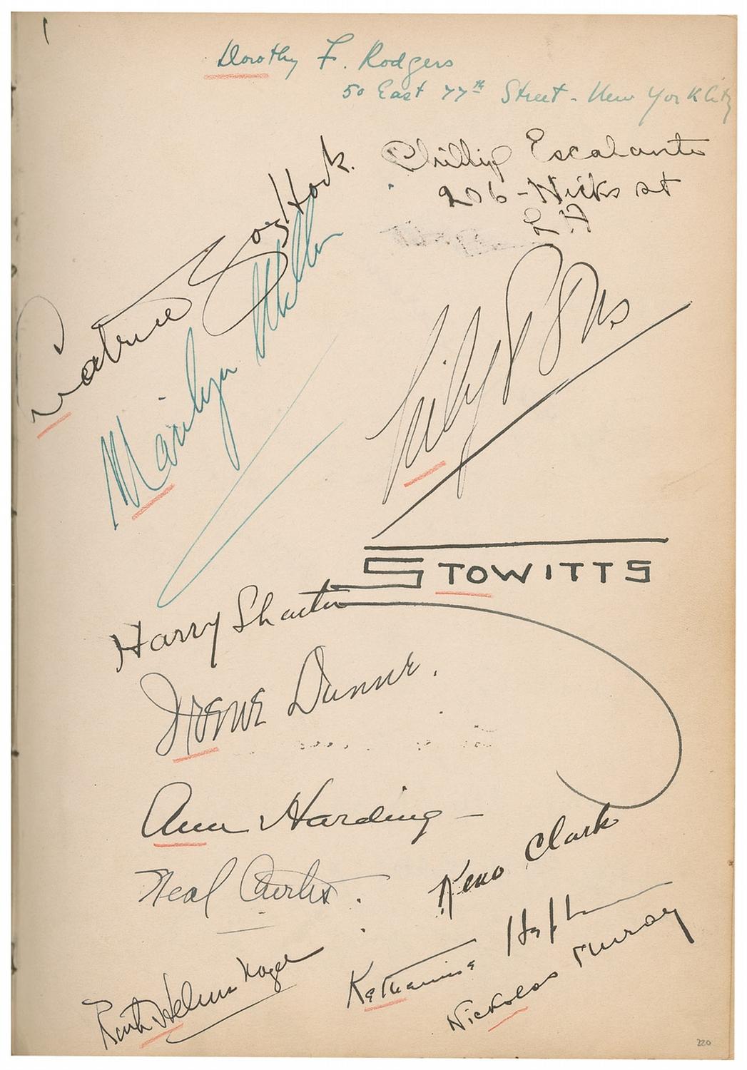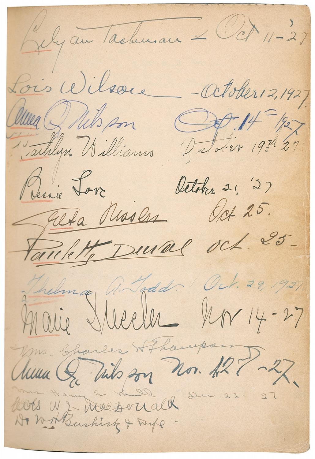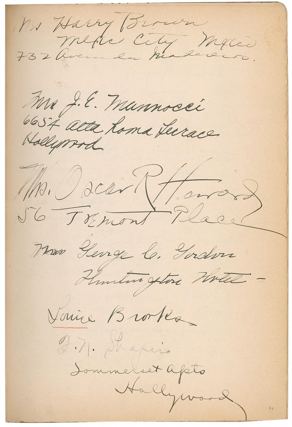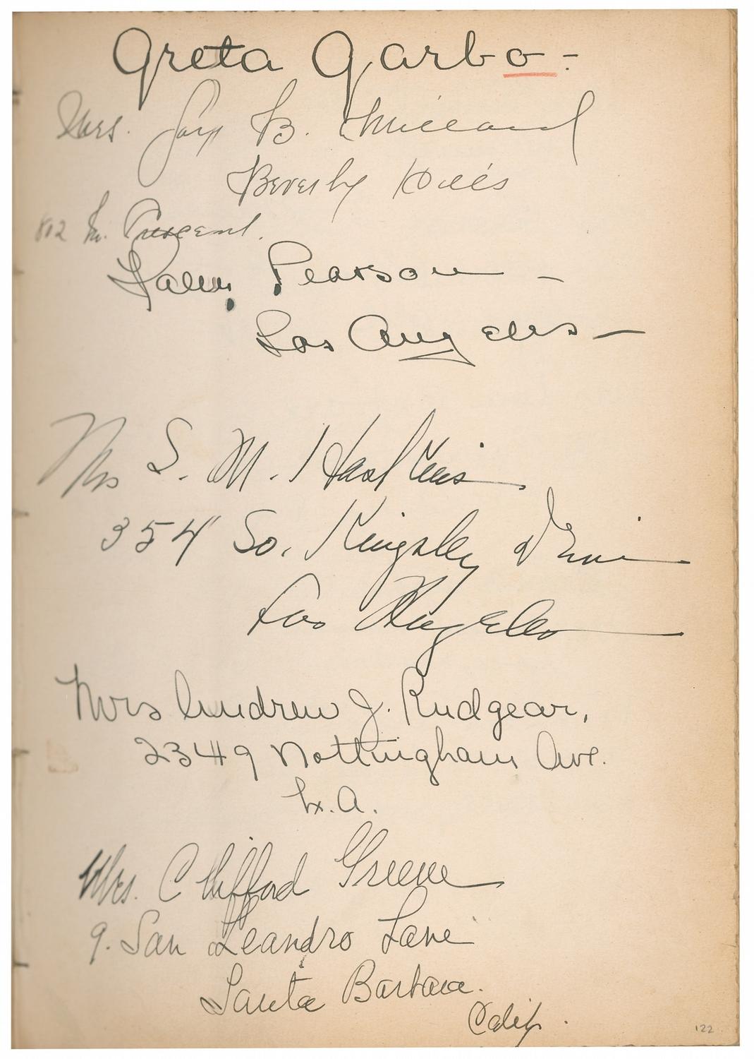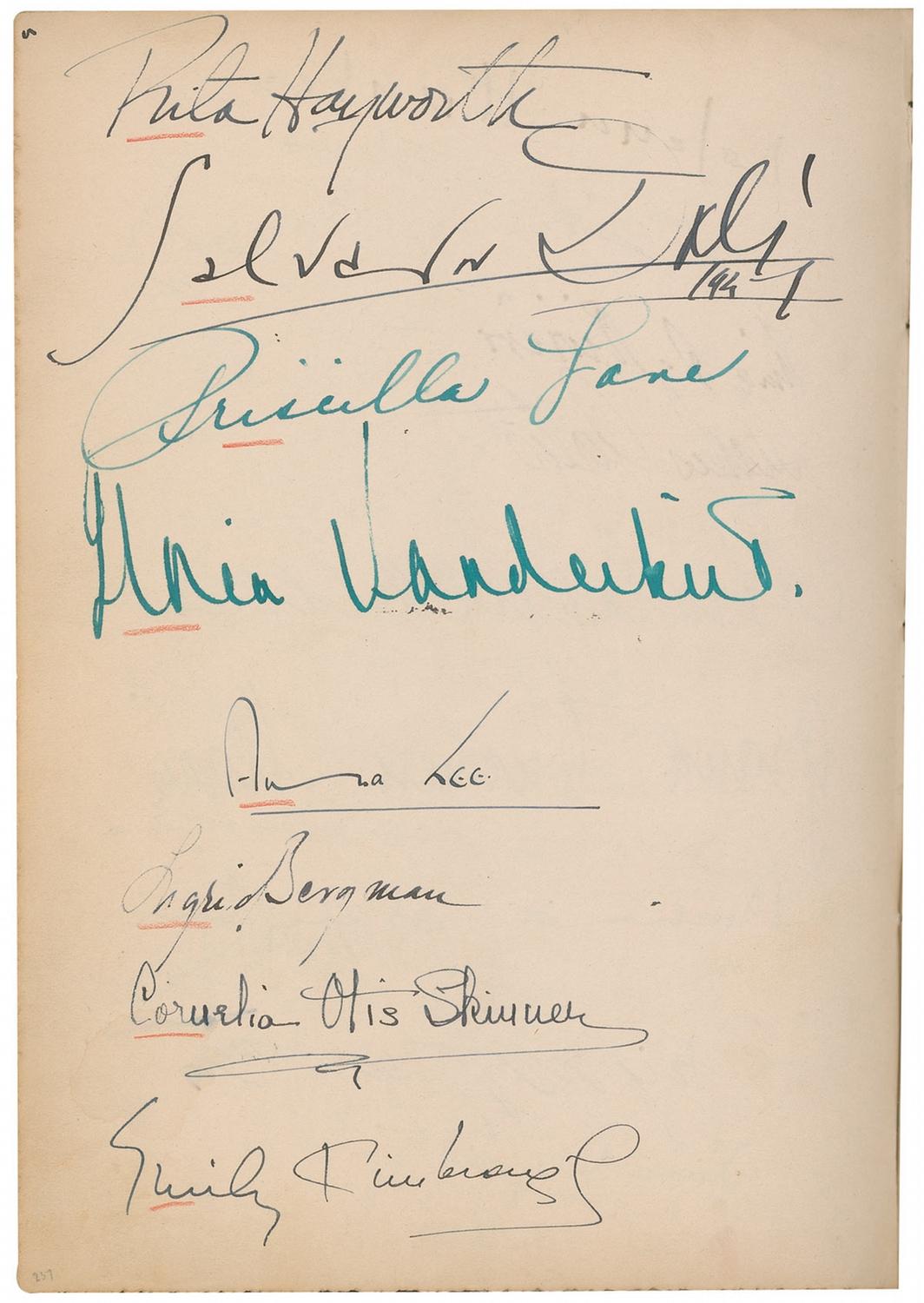 Vintage leather bound hardcover autograph album, 7.5 x 10.25, dating from 1927 to approximately 1947, signed inside by over 450 people, with all pages multi-signed, and back-to-back. Front of book is embossed with the name of Howard Greer, a Hollywood costume designer, as well as the Chief Costume Designer at Paramount from 1924–1927. Signers include: Greta Garbo, Thelma Todd, Harold Lloyd, Mary Pickford, Katharine Hepburn, Basil Rathbone, Vivien Leigh, Charles Laughton, Rita Hayworth, Salvador Dali, Ingrid Bergman, Shirley Temple, Greer Garson, George Bernard Shaw, Billie Burke Ziegfield, Marlene Dietrich, Al Jolson, Frank Capra, Walter Plunkett, Edith Head, Louise Brooks, W[illiam] Randolph Hearst, Marion Davies, Carl Van Vechten, James Montgomery Flagg, Carl Laemmle, Jr., Vilma Banky, Joseph Schildkraut, Paul Bern, Barbara Stanwyck Fay, Helen Kane, Helen Hayes, Norma Shearer, Kay Francis, Cecil Beaton, Fay Wray, Jeanette MacDonald, Anna May Wong, Noel Coward, Gwili Andre, Irene Dunne, Helen Twelvetrees, Elizabeth Arden, Clata Bow, Adrian (Wizard of Oz costumer), Zita Johann, Gracie Allen, Theda Bara, Margaret Sullivan, Doris Duke, Myrna Loy, Claudette Colbert, Tallulah Bankhead, Ginger Rogers, Leni Riefenstahl, Jennifer Jones, Susan Hayward, and Pola Negri. Uniform toning to inside pages, red pencil underlines to beginning of some of the signatures, and light rubbing and wear, including a bit of scattered light surface loss to covers and spine, otherwise fine condition. A more comprehensive list is available for download at rrauction.com.