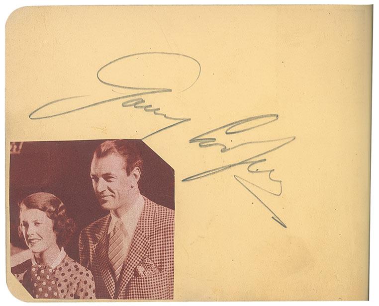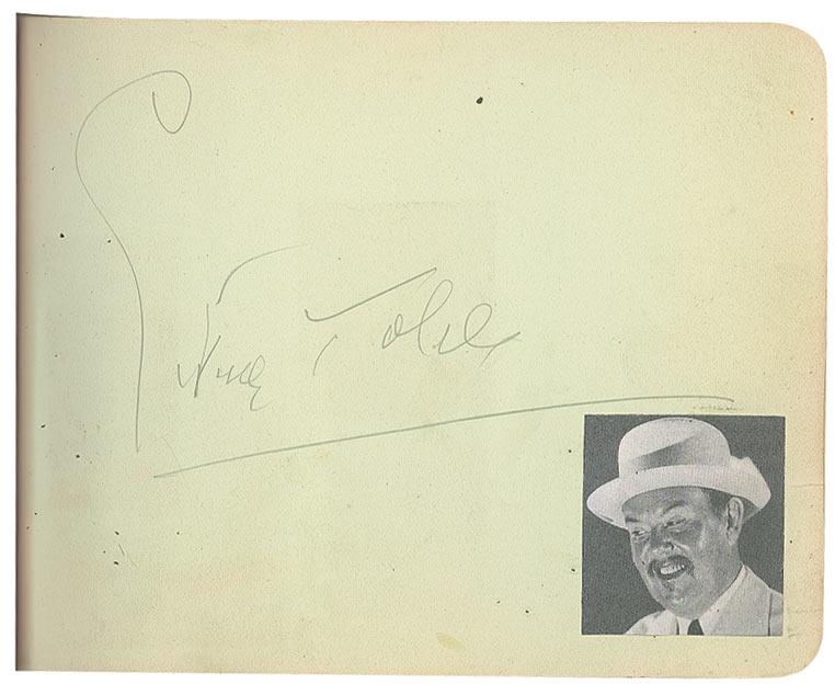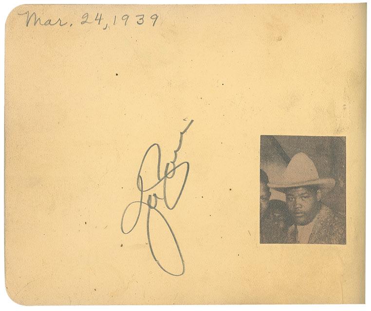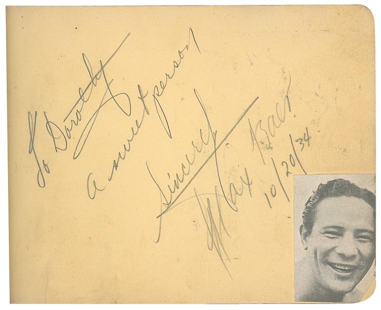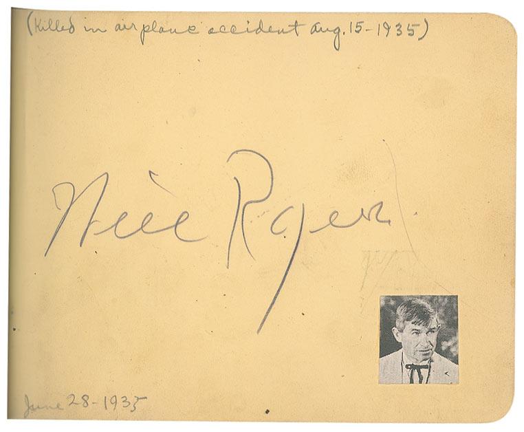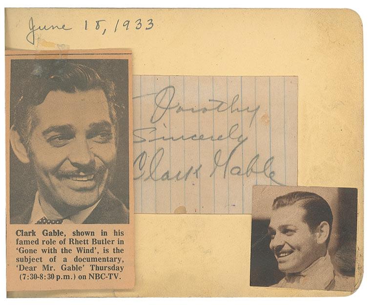 Vintage hardcover autograph album, 6 x 4.5, signed inside in pencil and fountain pen by 79 celebrities, with some of the signatures on attached cards, slips or letters, almost all single page, with all signatures back-to-back, and some inscribed. Signers include: Clark Gable, Will Rogers, Gary Cooper, Jack Haley, Bebe Daniels, Max Baer, Joe Louis, Lana Turner, Tony Martin, Kay Kyser, June Travis, Ida Lupino, Dizzy Dean, Jane Withers, Leo Carillo, Sidney Toler, Warner Baxter, Joan Blondell, Gabby Hartnett, Jack Benny, and Eddie Rickenbacker. Scattered toning and rippling to pages, separated back cover, chipping to covers and spine, and scattered toning and soiling to pages, otherwise very good condition. Signatures were originally acquired at a restaurant in San Bernadino, California in the late 1930s and early 1940s.