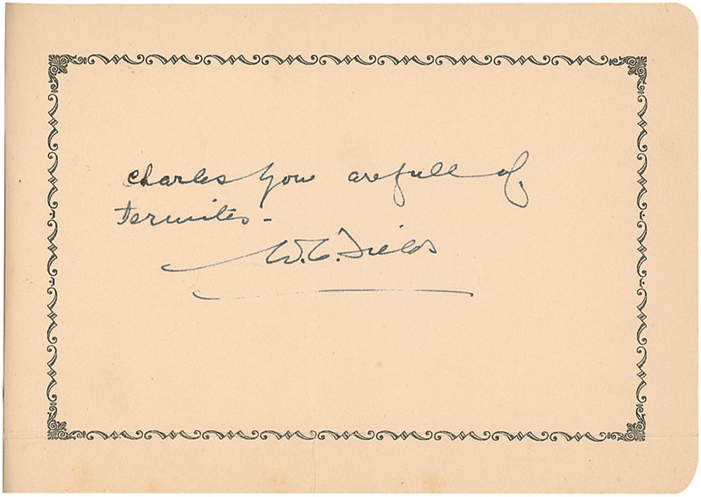 Vintage hardcover autograph album, 7 x 4.5, signed inside in fountain pen and pencil by 45 celebrities, all single page, with many adding brief inscriptions. Most pages also bear a clipped photo of the respective signer. Signers include: Irving Berlin, Max Baer, Dick Powell, Sig Romberg, W. H. Poole, Bing Crosby, Fred Astaire, Ted Malone, Mary Pickford, Ed Wynn, Robert Ripley, Rudy Vallee, Lowell Thomas, Milton Berle, Don Ameche, W. C. Fields, and Douglas Corrigan. In fine condition, with a central vertical fold to most of the pages. Album also bears stamped signatures of Edgar Bergen as well as one other stamped signature.