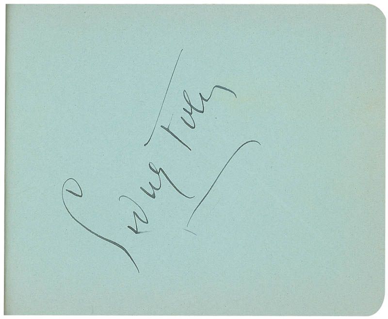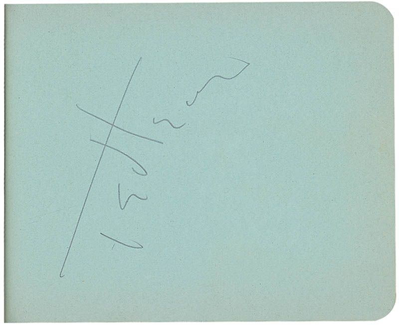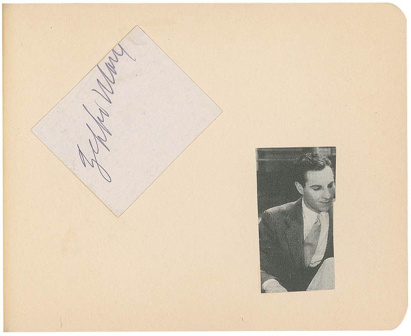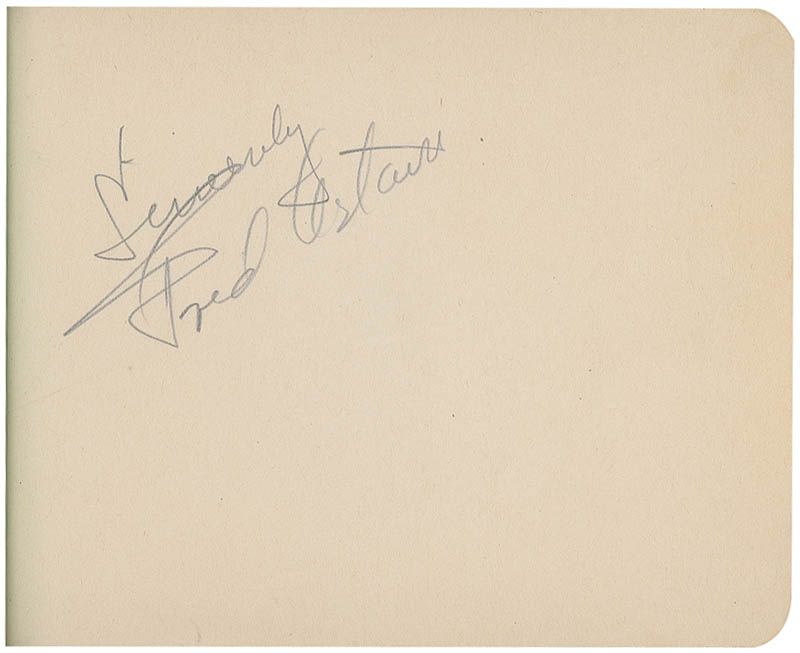 Vintage hardcover autograph album, 6.25 x 4.75, signed inside in ink and pencil by 35 actors and actresses. Most pages signed on a single side, with a few signed on both sides (including the Toler), and a small number of signatures clipped and affixed. Signers include: Sidney Toler, Ted Healy, Zeppo Marx, Fred Astaire, Claudette Colbert, Virginia Cherrill Grant, Andy Devine, Patrice Wymore, Jack La Rue, Francis Lederer, Maxie Rosenbloom, Edmund Lowe, Gail Patrick, Joe E. Brown, George Raft (2), Paul Lukas, John Boles, Ann Dvorak, Alice White, Robert Woolsey, Virginia Bruce Gilbert, Melvyn Douglas, and Adolphe Menjou. Many pages also feature an affixed magazine photo of the respective signer. In fine condition, with some trivial rippling to the pages.