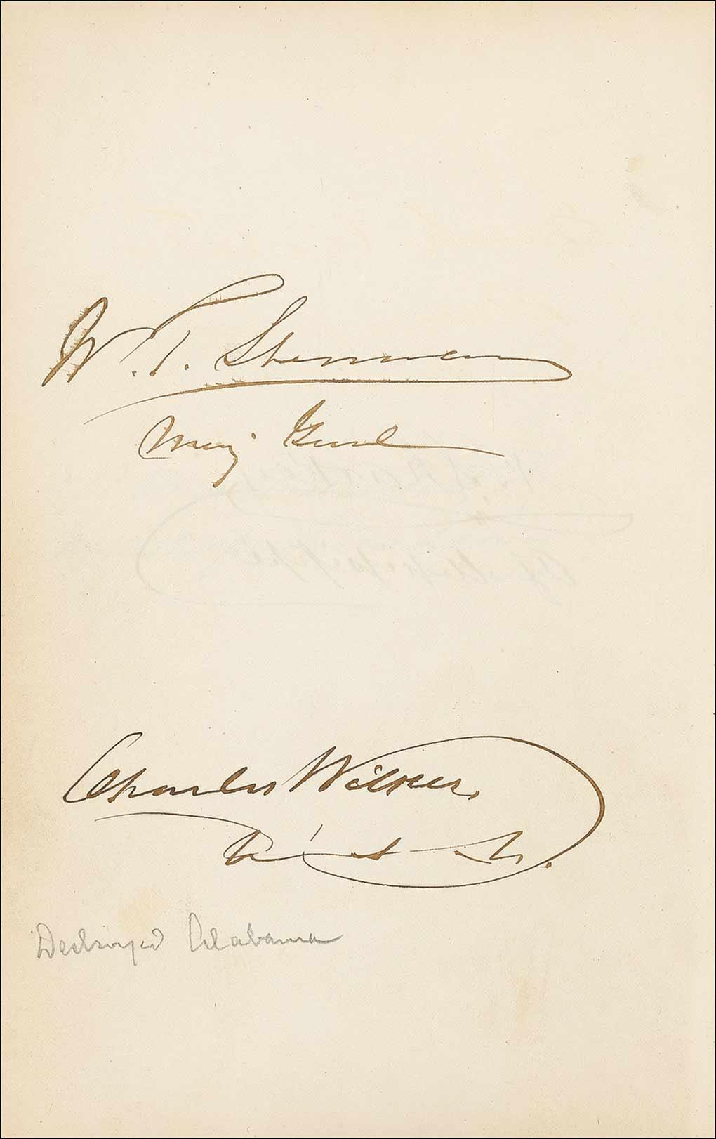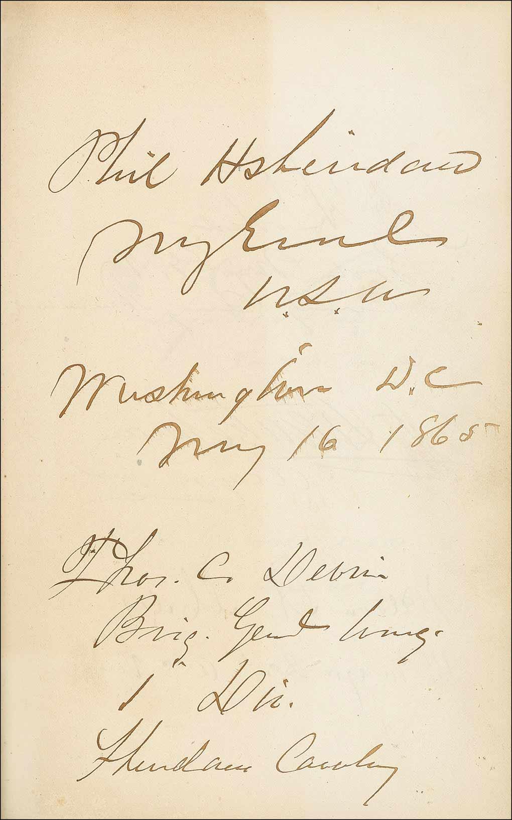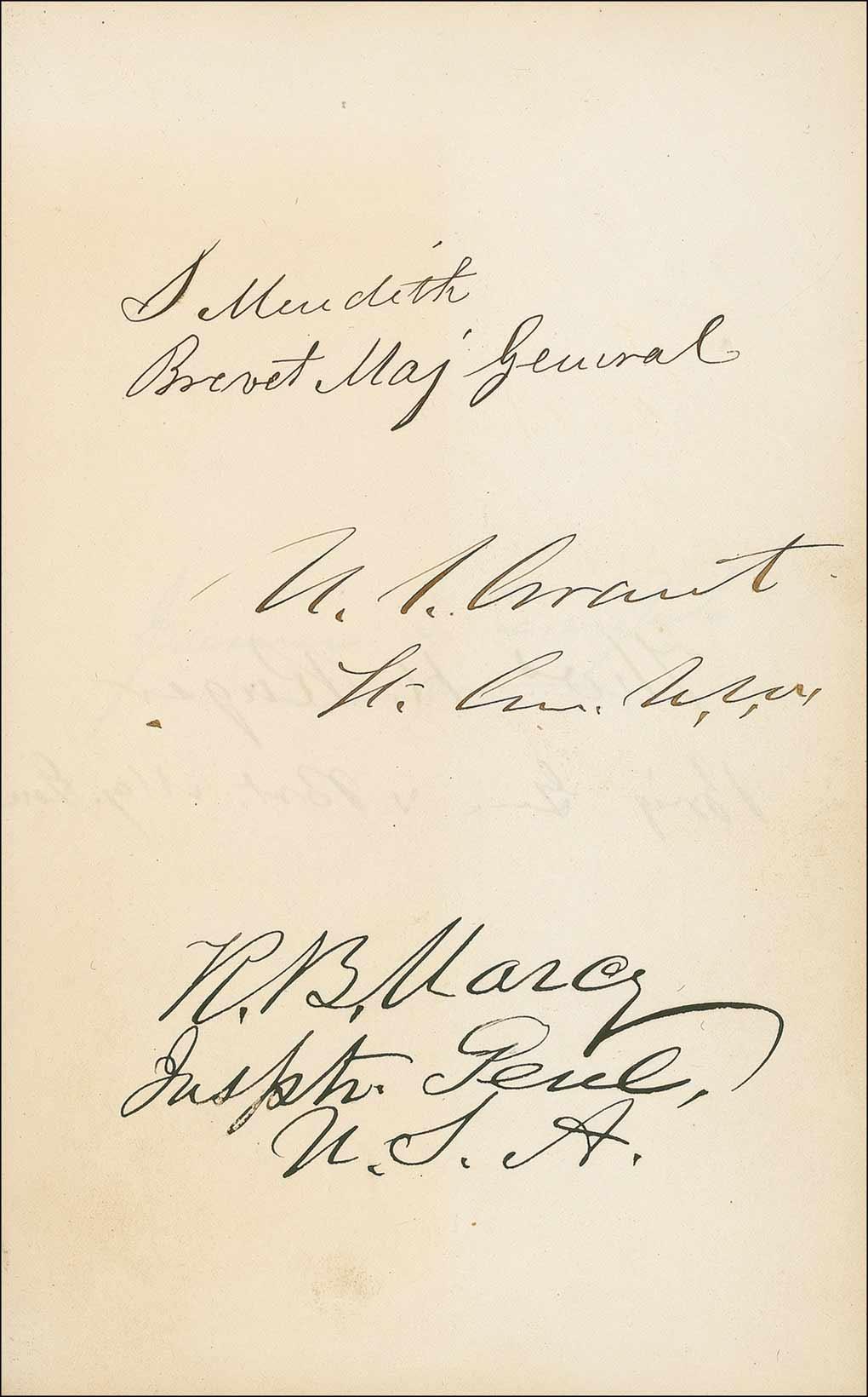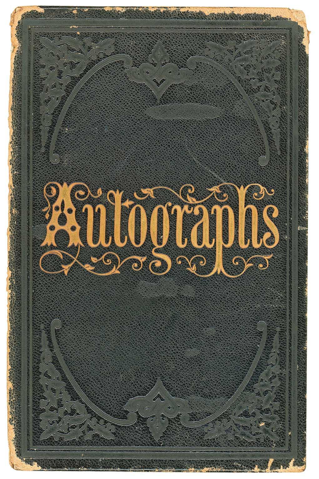 Fantastic hardcover autograph album, 5.5 x 7.5, signed inside by 215 notables, including three presidents, Union and Confederate officers, authors, politicians, and other notables. Signatures were acquired by the wife of a Civil War Major General as they traveled amongst the finest company of their era. Most pages bear several signatures each, some on affixed cards or slips, with all also back-to-back. Signers include: U. S. Grant, Andrew Johnson, James A. Garfield, Joshua Chamberlain, John C. Fremont, Winfield Scott Hancock, Oliver O. Howard, John A. Logan, Nelson A. Miles, William S. Rosencrans, Carl Schurz, Philip H. Sheridan, William T. Sherman, Daniel E. Sickles, Henry W. Slocum, George Henry Thomas, Lew Wallace, P. G. T. Beauregard, Jospeh E. Johnston, Fitzhugh Lee, William Mahone, Albert Pike, Nathaniel P. Banks, Henry Ward Beecher, Salmon P. Chase, Schuyler Colfax, Horace Greeley, John K. Porter, William H. Seward, Edward Stanton, Alexander Stephens, W. A. “Billy” Sunday, Gideon Welles, John S. Worden, Thaddeus Stevens, and Fitz John Porter. A more comprehensive list is available online at rrauction.com. Affixed to the last page is a war-dated pass issued by the Provost Marshal General’s Office in City Point, Virginia, to Mr. Shelly, granting him “permission to pass from these Headquarters within the lines and to Washington.” Affixed above that is a one week pass issued to Shelly to allow him “inside the fort and return.” Inside of album rates fine condition, with detached covers, missing portions of spine, and scattered light surface wear to covers as well.