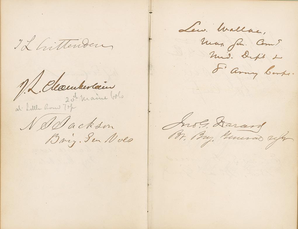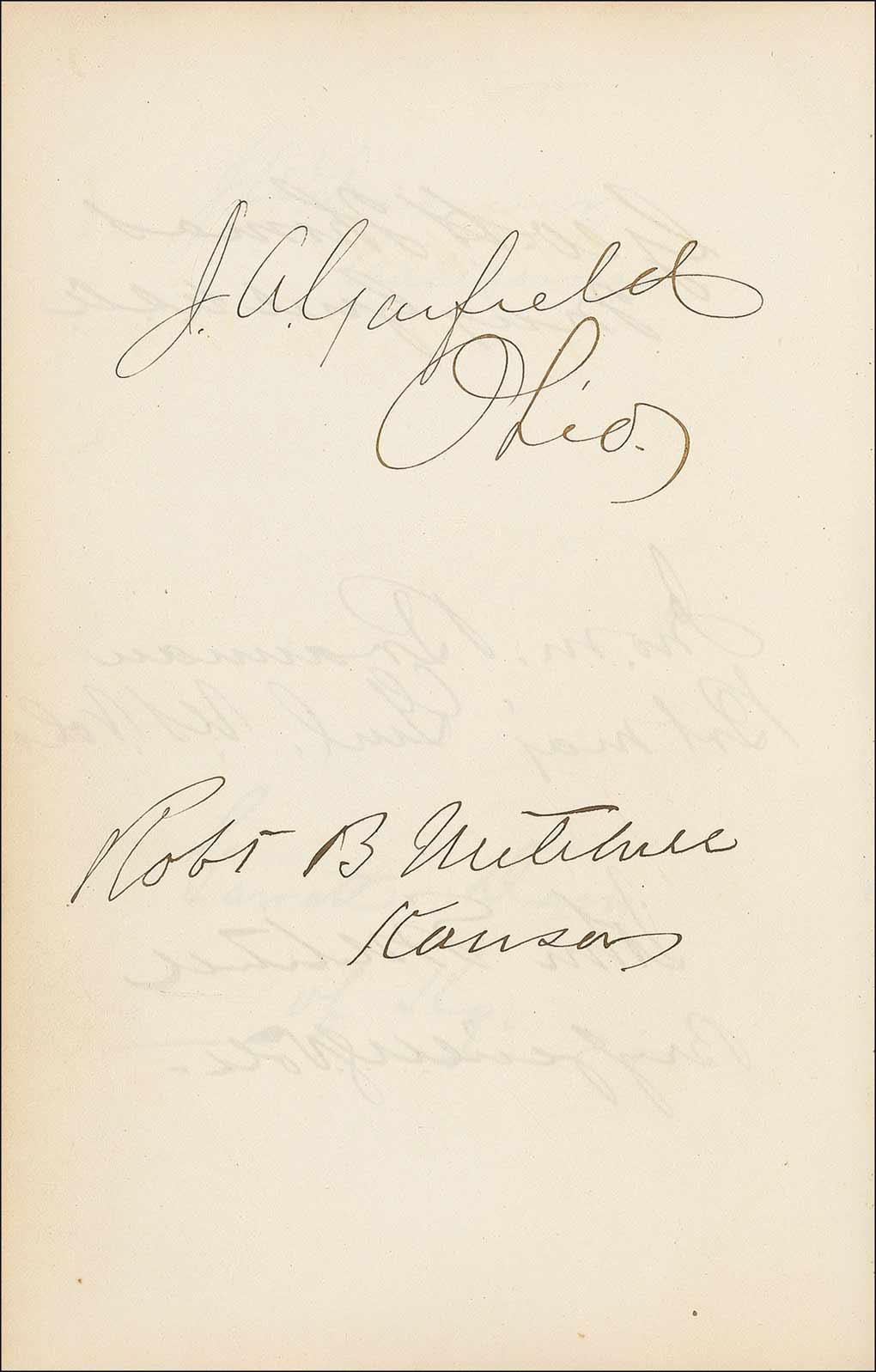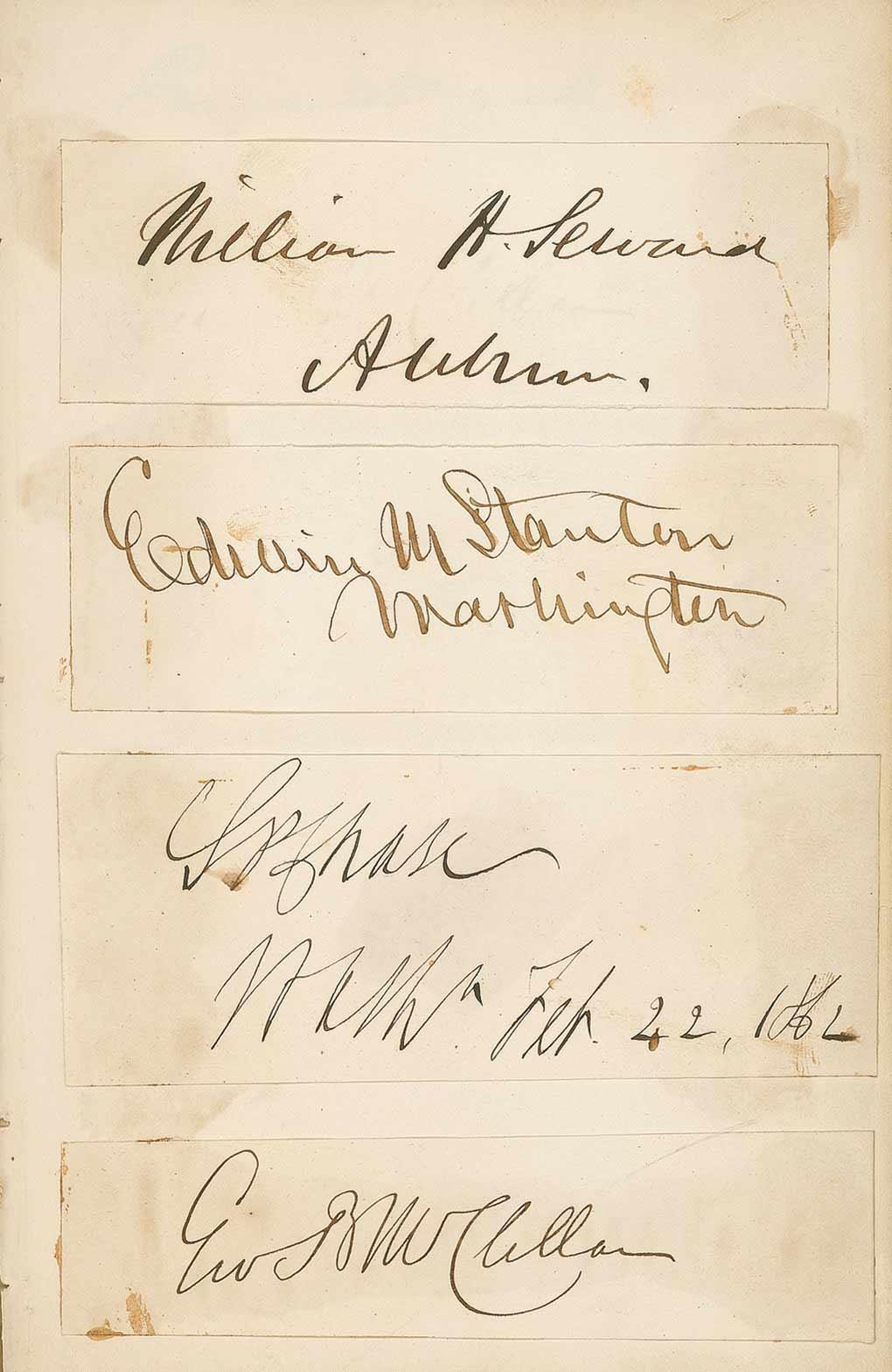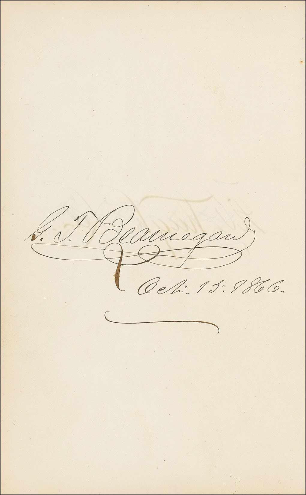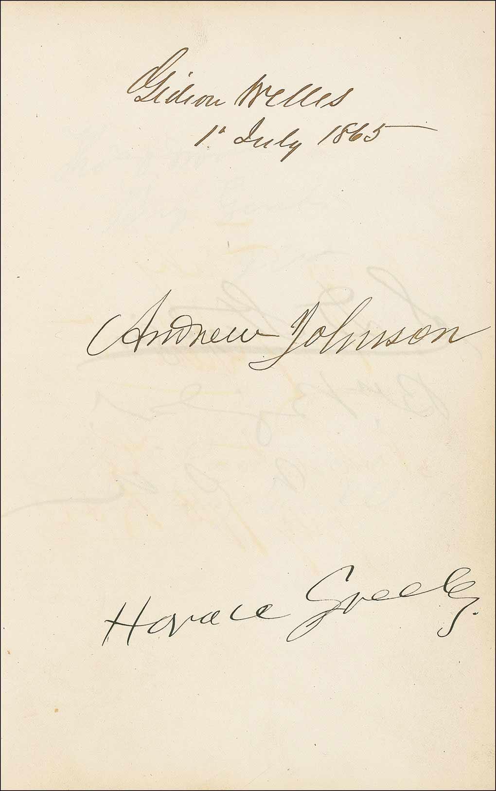 Fantastic hardcover autograph album, 5.5 x 7.5, signed inside by 215 notables, including three presidents, Union and Confederate officers, authors, politicians, and other notables. Signatures were acquired by the wife of a Civil War Major General as they traveled amongst the finest company of their era. Most pages bear several signatures each, some on affixed cards or slips, with all also back-to-back. Signers include: U. S. Grant, Andrew Johnson, James A. Garfield, Joshua Chamberlain, John C. Fremont, Winfield Scott Hancock, Oliver O. Howard, John A. Logan, Nelson A. Miles, William S. Rosencrans, Carl Schurz, Philip H. Sheridan, William T. Sherman, Daniel E. Sickles, Henry W. Slocum, George Henry Thomas, Lew Wallace, P. G. T. Beauregard, Jospeh E. Johnston, Fitzhugh Lee, William Mahone, Albert Pike, Nathaniel P. Banks, Henry Ward Beecher, Salmon P. Chase, Schuyler Colfax, Horace Greeley, John K. Porter, William H. Seward, Edward Stanton, Alexander Stephens, W. A. “Billy” Sunday, Gideon Welles, John S. Worden, Thaddeus Stevens, and Fitz John Porter. A more comprehensive list is available online at rrauction.com. Affixed to the last page is a war-dated pass issued by the Provost Marshal General’s Office in City Point, Virginia, to Mr. Shelly, granting him “permission to pass from these Headquarters within the lines and to Washington.” Affixed above that is a one week pass issued to Shelly to allow him “inside the fort and return.” Inside of album rates fine condition, with detached covers, missing portions of spine, and scattered light surface wear to covers as well.