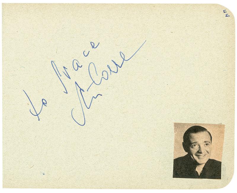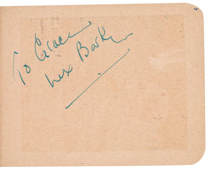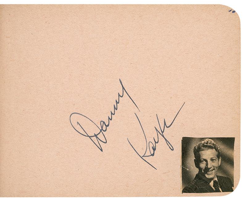Vintage softcover autograph album, 6 x 4, signed inside ink by 48 actors and actresses, almost all single page, with a few inscribing to Grace. Signers include: Susan Hayward (2), Peter Lorre, Lex Barker, Bill Boyd, Danny Kaye, Margaret O’Brien, Kim Hunter, Frederic March, Richard Widmark, Lee J. Cobb, Joan Fontaine, Sonja Henie, Eleanor Powell, Ida Lupino, June Havoc, Ann Miller, Glenn Ford, and Vera-Ellen. In fine condition, with various photos affixed inside album. Covers are worn and creased, but intact. RRAuction COA.