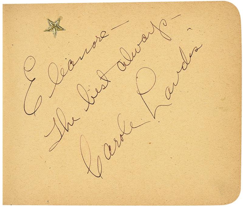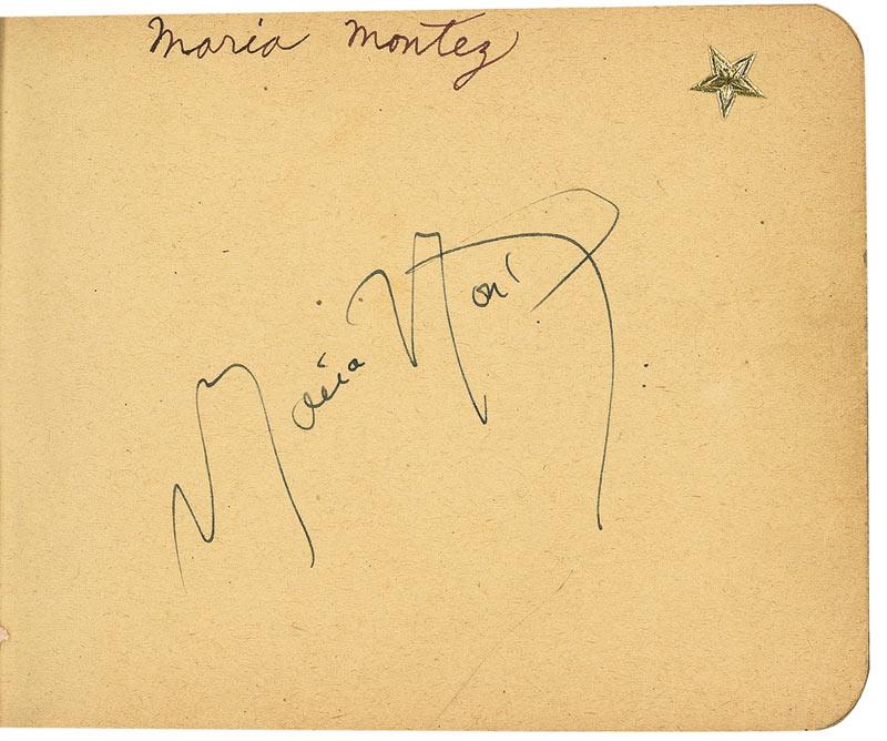 Vintage softcover autograph album, 6 x 4, signed inside ink by 37 actors and actresses, almost all single page, with a few adding brief inscriptions. Signers include: Carol Landis, Maria Montz, Dinah Shore (4), Mitzi Green, Sonja Henie, Jerry Colanna, Clifton Webb, Frank Buck, and Milton Berle. In very good condition, with various photos affixed inside album, and an application of a protective coating over some of the signatures. Covers are worn and creased, but intact. RRAuction COA.