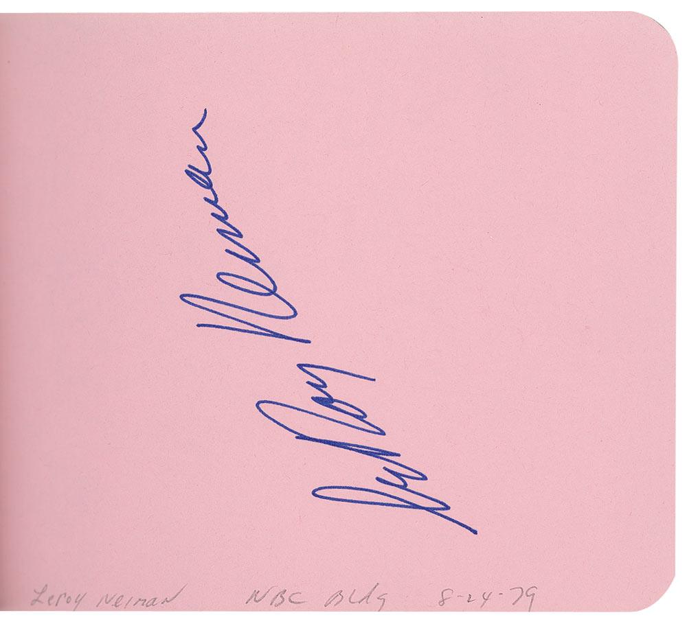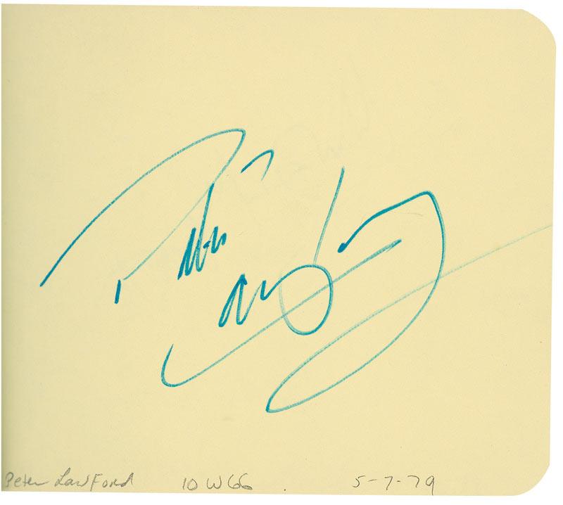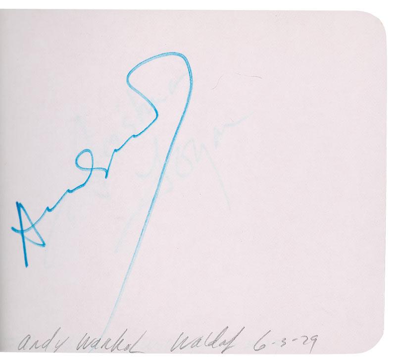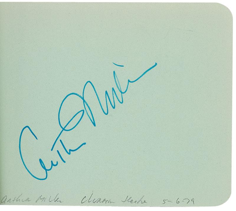 Hardcover autograph album, 6.25 x 4.75, signed inside in ink in 1979 and 1980 by 59 celebrities, all single page. Signers are: Loni Anderson, Joan Bennett, Elen Burstyn, Sammy Cahn, Claudette Colbert, Jeff Conway, Robert Coote, Arlene Dahl, Ruth Donnelly, Madge Evans, Douglas Fairbanks, Jr., Ruth Ford, Jodie Foster, Betty Garrett, Gloria Grahame, Joel Grey, Marvin Hamlisch, Julie Harris, John Houseman, Monte Irvin, Elia Kazan, Hope Lange, Peter Lawford, Lotte Lenya, Joe Levine, Joshua Logan, Myrna Loy, Sidney Lumet, Frank McHugh, Ann Miller, Arthur Miller, Patsy Ruth Miller, Clayton Moore, Michael Moriarty, Caroline Munro, LeRoy Neiman, Maureen O’Sullivan, Geraldine Page Torn, Floyd Patterson, Tony Perkins, Joan Plowright, Cliff Robertson, Susan Sarandon, Arthur Schlesinger, Martha Scott (2), Brooke Shields, Maggie Smith, Gale Sondergaard, Maureen Stapleton, Isaac Stern, Lee Strassberg, Blanche Sweet, Arthur Tracy, Eli Wallach, Andy Warhol, Sigourney Weaver, Margaret Whiting, Shelly Winters. In fine condition, with toning to some of the page edges.