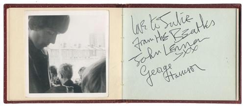 Both have signed this light green colored autograph album page very nicely in black ballpoint pen. John has written “Love to Julie from the Beatles” above his signature and “XXX” following. The signatures on this page date from mid 1963. Also included is a snap shot of George signing this autograph book, taken by the owner at the time, which is great to have because it’s actually very rare to have a photograph of a Beatles signing any particular item. Other signatories in the book include Cliff Richards. The Lennon and Harrison signed page is in excellent condition, having been well preserved within the book. The autograph book measures 5 x 4.25”. VG condition.