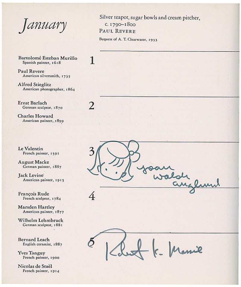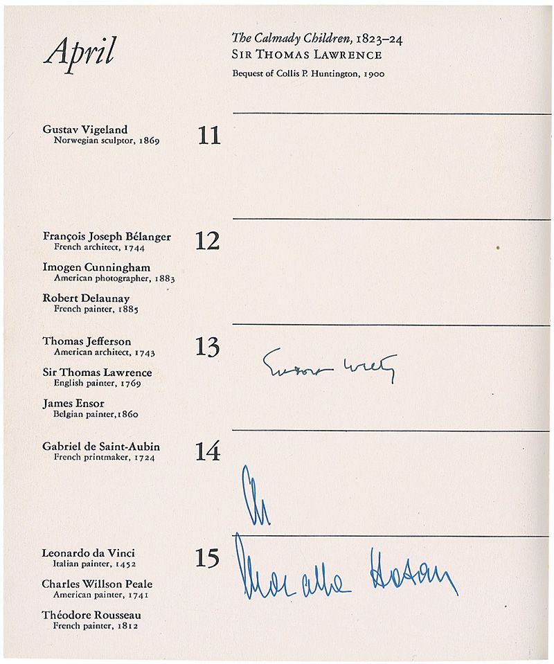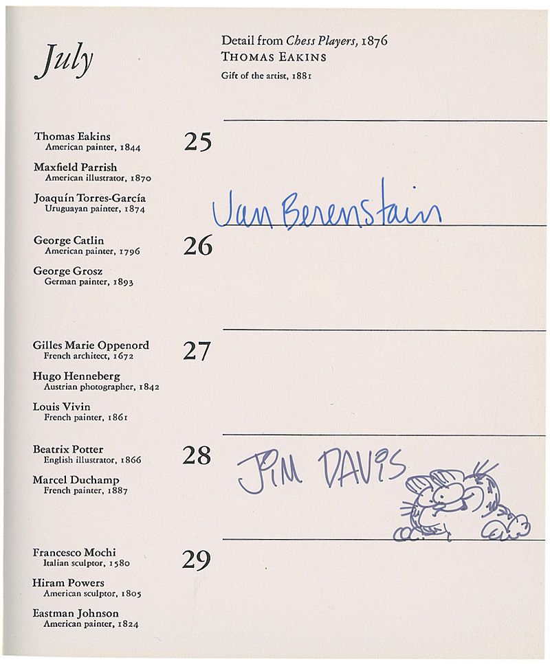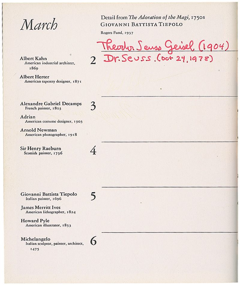 Hardcover birthday date book, 6 x 7, published in 1977 by the Metropolitan Museum of Art, signed inside in ink and felt tip by 52 celebrities, all signing on their respective birthdate. Signers include: Dr. Seuss, Gloria Swanson, Eudora Welty, Margot Fonteyn, William Styron, Jim Davis, Ray Bradbury, Lauren Bacall, Stan Berenstein, Fran Lebowitz, and Alistair Cooke. In fine condition.