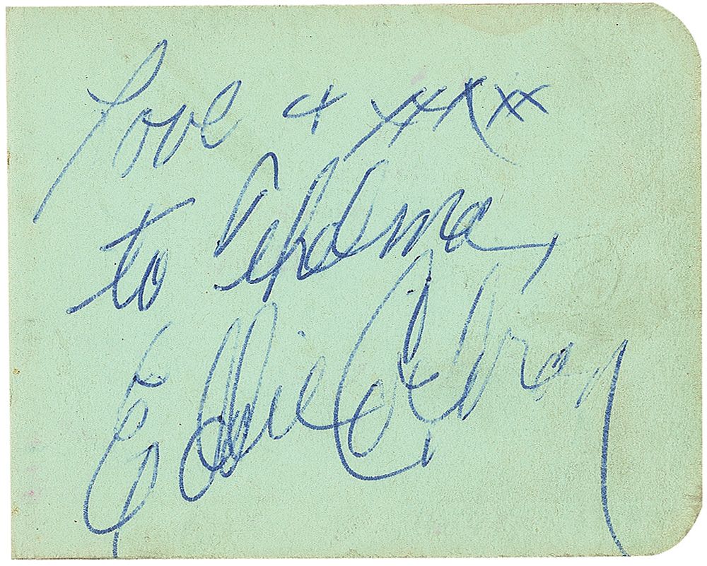 Vintage hardcover 3.5 x 2.75 autograph album, signed inside in ballpoint and pencil by 18 performers, most single page with most signatures also back-to-back, with many adding inscriptions to Thelma. Signers include: Eddie Cochran (ins), Billy Fury, Michael Cox, Marti Wilde, Johnnie Gentle (2), Jack Good, Emile Ford, Lance Fortune, and The Checkmates. In very good condition, with several loose pages, scattered light toning and soiling, and some skipping and irregular adhesion to Cochran’s signature.