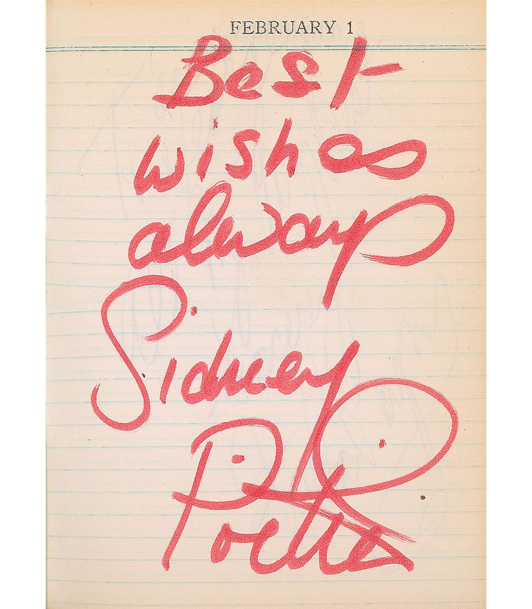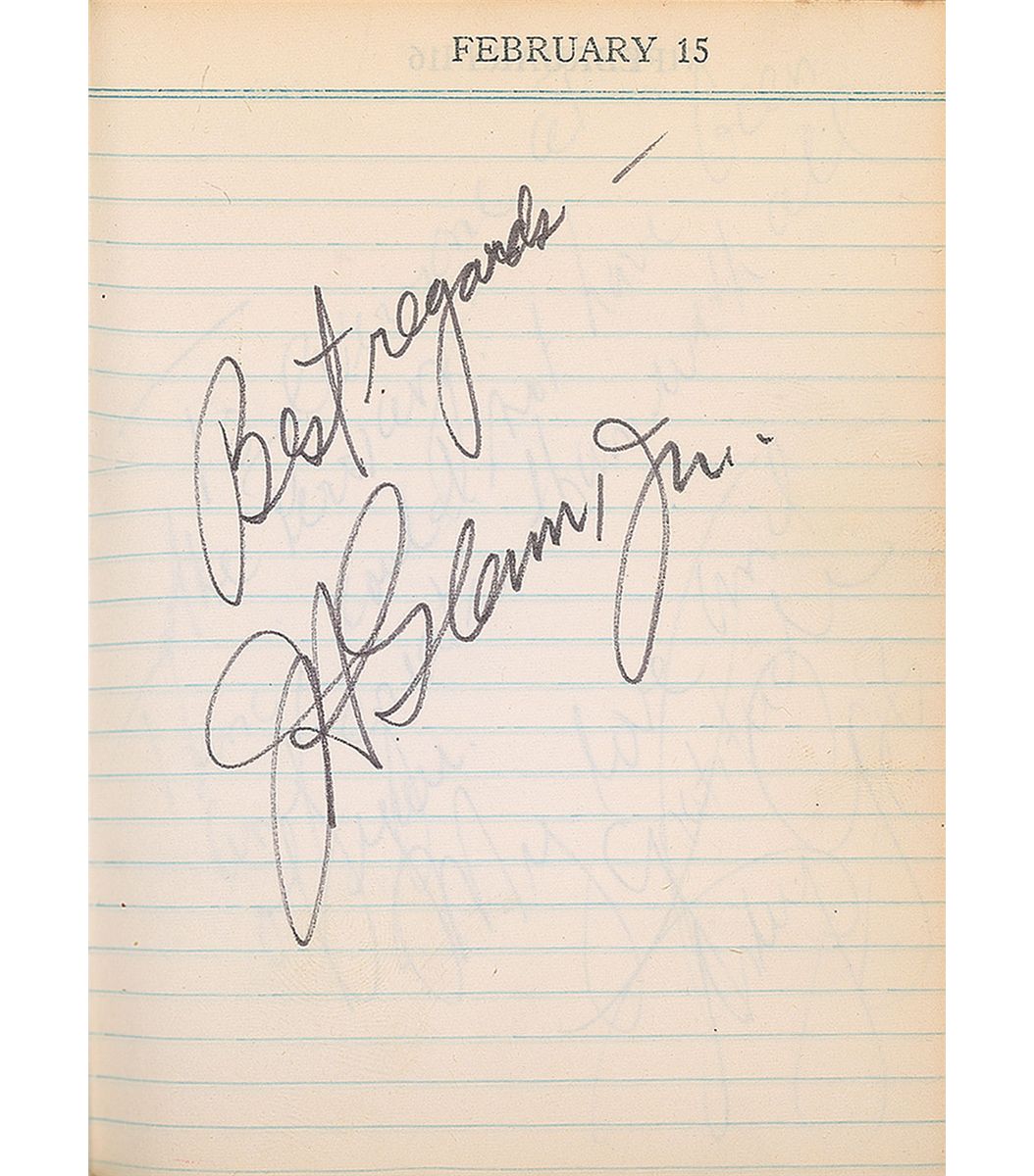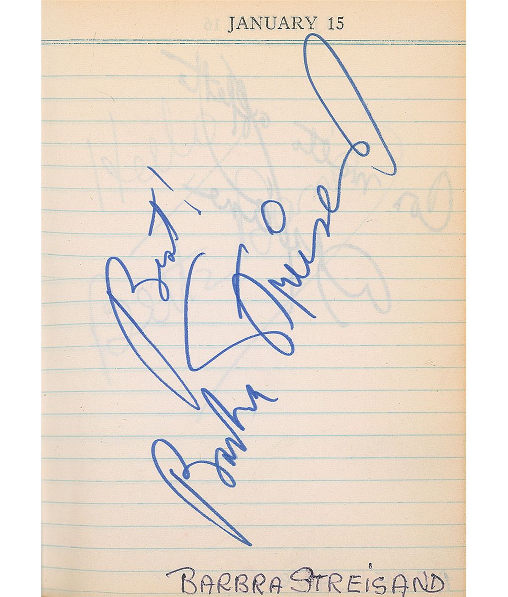 Hardcover ‘diary’ book with lined pages, 4.25 x 5.5, signed inside in ink by an array of celebrities, most pages signed on both sides. Signers include: Barbra Streisand, Bette Davis, Sidney Poitier, John Glenn, Richard Rodgers, Eartha Kitt, Ralph Young, Abbe Lane, Milton Berle, Arthur Godfrey, Buddy Hackett, Loretta Young, Connie Francis, Danny Kaye, John Gary, Diahann Carroll, Henny Youngman, Jill St. John, Ed Ames, Vikki Carr, Gail Martin, John Davidson, John Gary, Freda Payne, Pat Rolle, and Mayor John Lindsay. Also includes a laid-in 5 x 3 card signed in ballpoint by Richard Rodgers, Mary Martin, Juan Carlos I of Spain, and Sophia of Greece and Denmark. Interior pages in fine condition, some with slight show-through from signatures to opposing sides (no key signatures are back-to-back); front cover of the album has become detached. These autographs were collected by the wife of the general manager of the Plaza Hotel