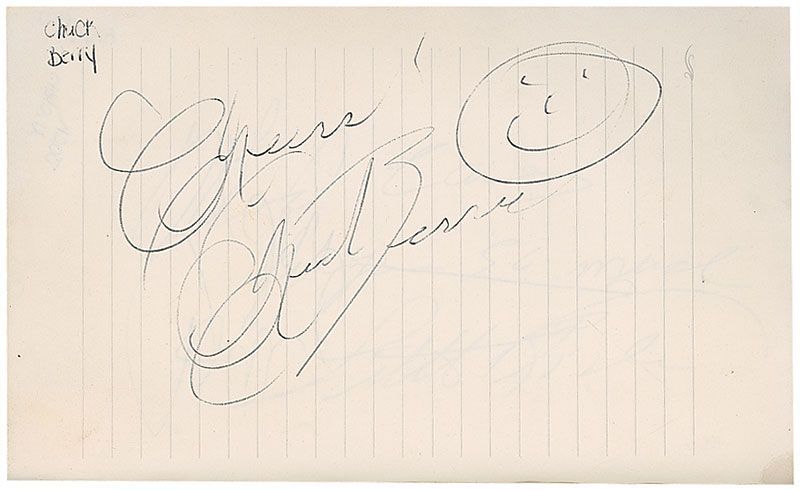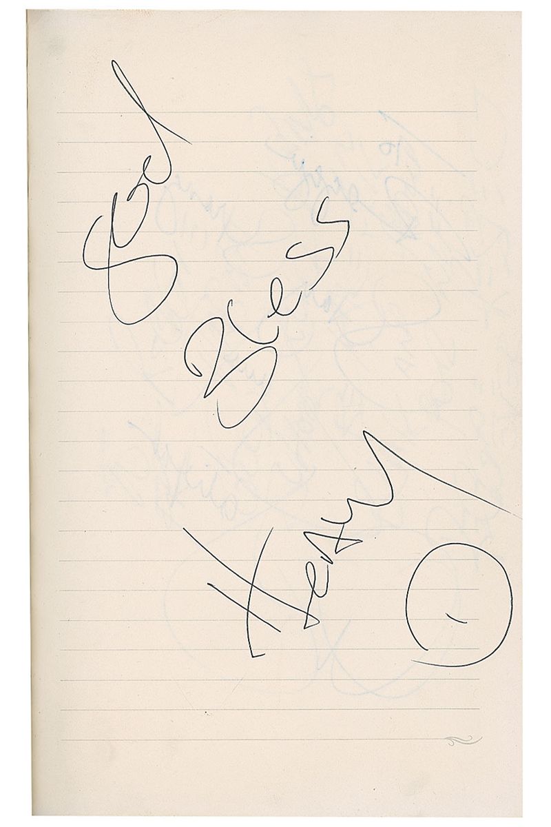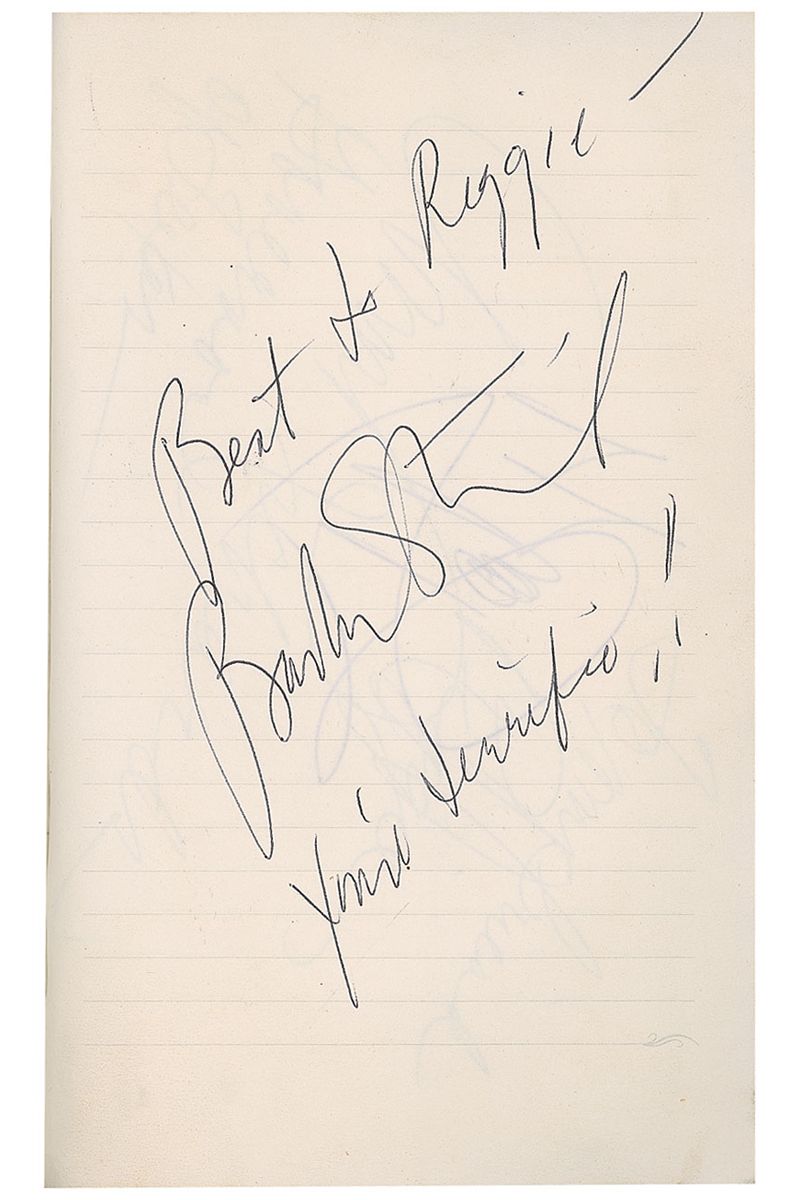 Hardcover autograph book with lined pages, 5.5 x 8.5, signed inside by a variety of musicians and celebrities in black ballpoint, most inscribed to “Reggie.” Signers include: Michael Jackson, Barbra Streisand, Heavy D, Chuck Berry, Judy Collins, Little Richard, Jack Nicholson, Wynton Marsalis, Judith Jamison, Goldie Hawn, Chevy Chase, Sally Field, Barbara Hendricks, Barry Manilow, Jack Lemmon, Bill Cosby, Macaulay Culkin, Mark McEwan, James Earl Jones, Herbie Hancock, Edward James Olmos, and Annette Bening. Some soiling and dampstaining affecting the first few pages but none of the signatures, otherwise fine condition.