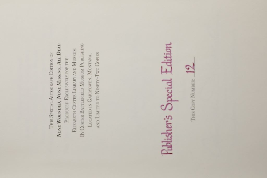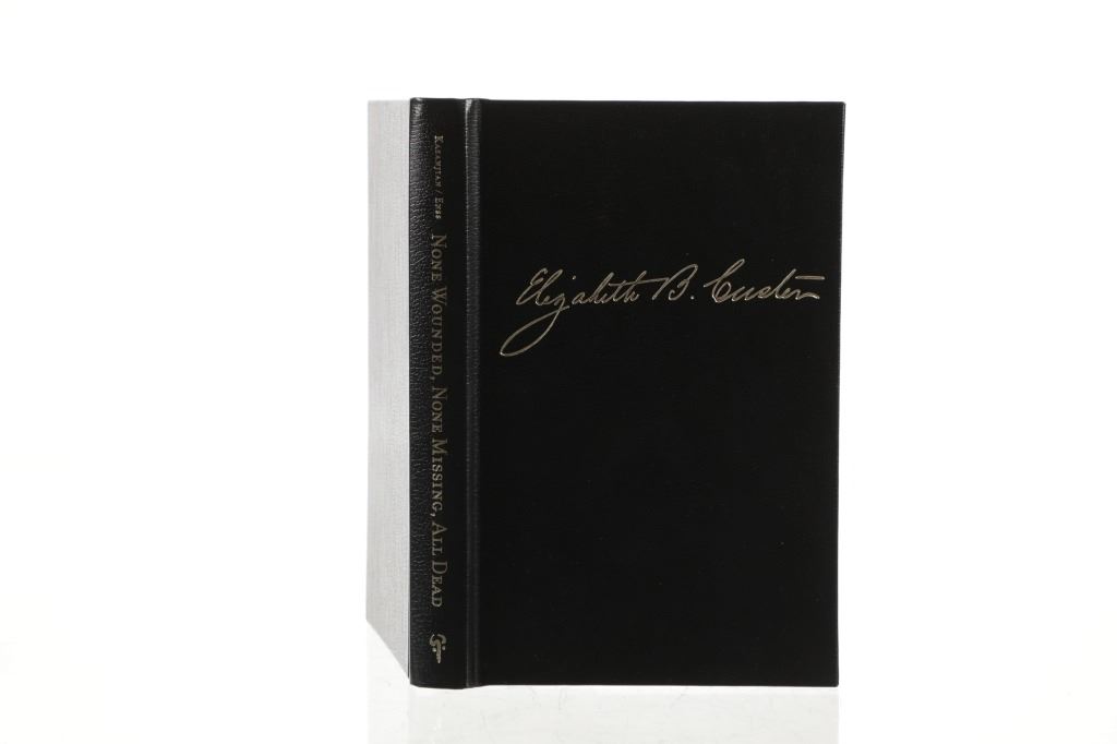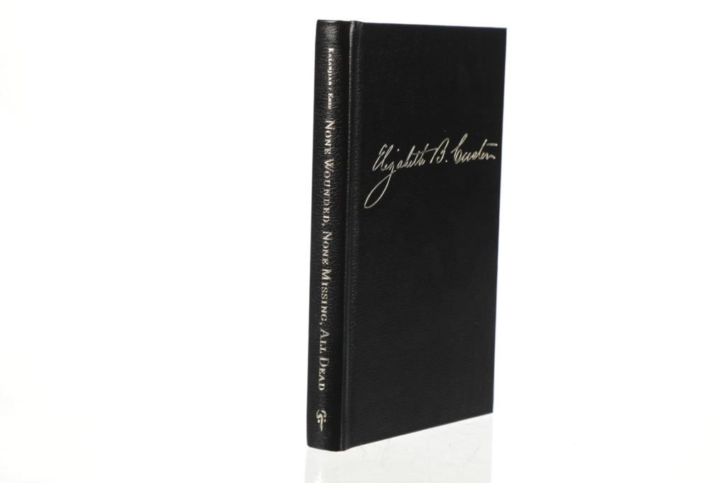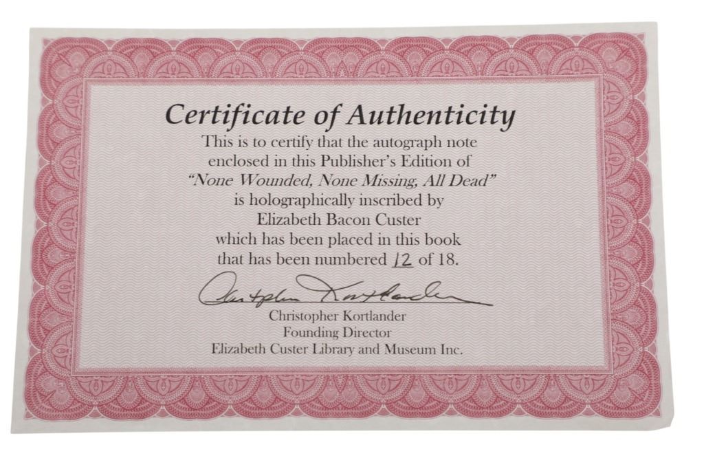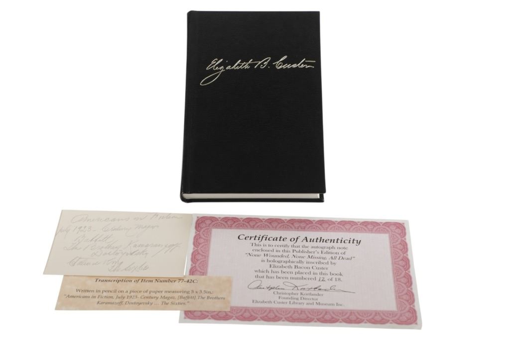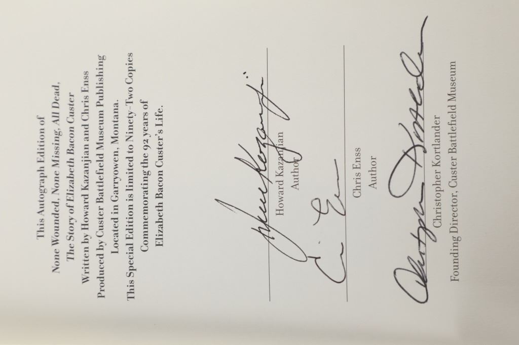 Featured in this lot is this Autograph Edition of "None Wounded, None Missing, All Dead" by Howard Kazanjian and Chris Enss with holographically inscribed note by Elizabeth Bacon Custer positioned in the rear. This is a limited edition autographed edition numbered 12/18. This book is a story of Elizabeth Bacon Custer and includes information acquired by Chris Kortlander including a 5000pg manuscript and in every copy of this limited edition series is placed a piece written in Elizabeth's own hand. The book comes complete with a Certificate of Authenticity from the Founding Director at Elizabeth Custer Library and Museum Inc. In the beginning pages is included a modern printed CDV of Elizabeth Custer circa 1865 originally. Elizabeth Bacon Custer was born on April 8, 1842, in Monroe, Michigan, and died on April 4, 1933, in New York City. She was the wife of General George Armstrong Custer and became widely known for her tireless efforts to preserve and enhance her husband’s legacy after his death at the Battle of the Little Bighorn in 1876. Following his death, Elizabeth never remarried and instead dedicated her life to writing and lecturing in defense of Custer's reputation, portraying him as a gallant hero rather than a reckless commander. Her books, including Boots and Saddles, Following the Guidon, and Tenting on the Plains, offered romanticized accounts of their life together and significantly shaped public perception of Custer for generations. The condition of this book and Elizabeth Custer related ephemera is well preserved with no obvious signs of damage with some browning to the hand written note in the rear of the book but otherwise shows a well preserved overall condition. The measurements of this 8 7/8" x 5 3/4". The collective weight of this book is 1lb.