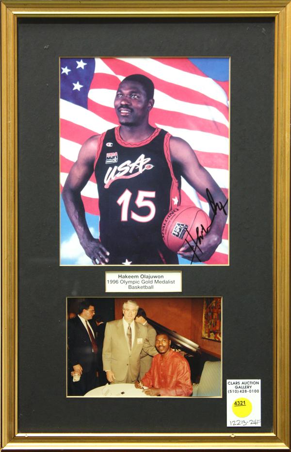 Framed autographed photograph, bears signature of 1996 Olympic Gold Medalist in basketball ''Hakeem Olajuwon,'' overall: 16.75''h x 11''w