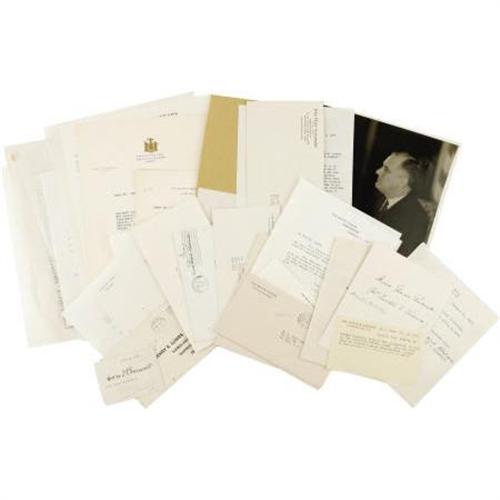 <B>Autograph Hoard Mostly Pertaining to Franklin and Eleanor Roosevelt, </B></I> as follows:<BR><B>Two Franklin Roosevelt Typed Letters Signed</B></I> as Governor of New York, 1932.<BR><B>Franklin Roosevelt,</B></I> autograph card as President.<BR><B>Sara D. Roosevelt,</B></I> the President's mother, two autograph cards.<BR><B>Franklin Roosevelt,</B></I> 8” x 10” photograph from White House, 1935.<BR><B>First Lady Eleanor Roosevelt,</B></I> ten autographs, mostly cards.<BR><B>Eleanor B. Roosevelt,</B></I> wife of Theodore Roosevelt, Jr., TLS.<BR>All items good to very fine condition. <I>From the collection of Henry E. Luhrs.</B></I><BR><BR><b>Shipping:</b> Miscellaneous Collectibles, Smal (<a target="_blank" href="http://www.heritageauctions.com/common/shipping.php">view shipping information</a>)