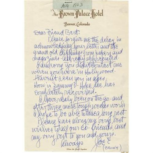 <B>Autograph Letter Signed by Joe E. Brown.</B></I> On Brown Palace Hotel stationary, one page, 7" x 10.5", August, 1963, signed "<I>Joe E. (Brown)"</B></I>. Brown, a vaudeville comedian and movie star, starred opposite Jack Lemmon in Billy Wilder's 1959 hit <I>Some Like It Hot</B></I>, and featured in the first all-color, all-talking musical comedy in 1929. Document, though exhibiting two width-wise creases for mailing, is in fine condition and is accompanied by three newspaper obituaries.<BR><BR><b>Shipping:</b> Flat Material, Small (<a target="_blank" href="http://www.heritageauctions.com/common/shipping.php">view shipping information</a>)