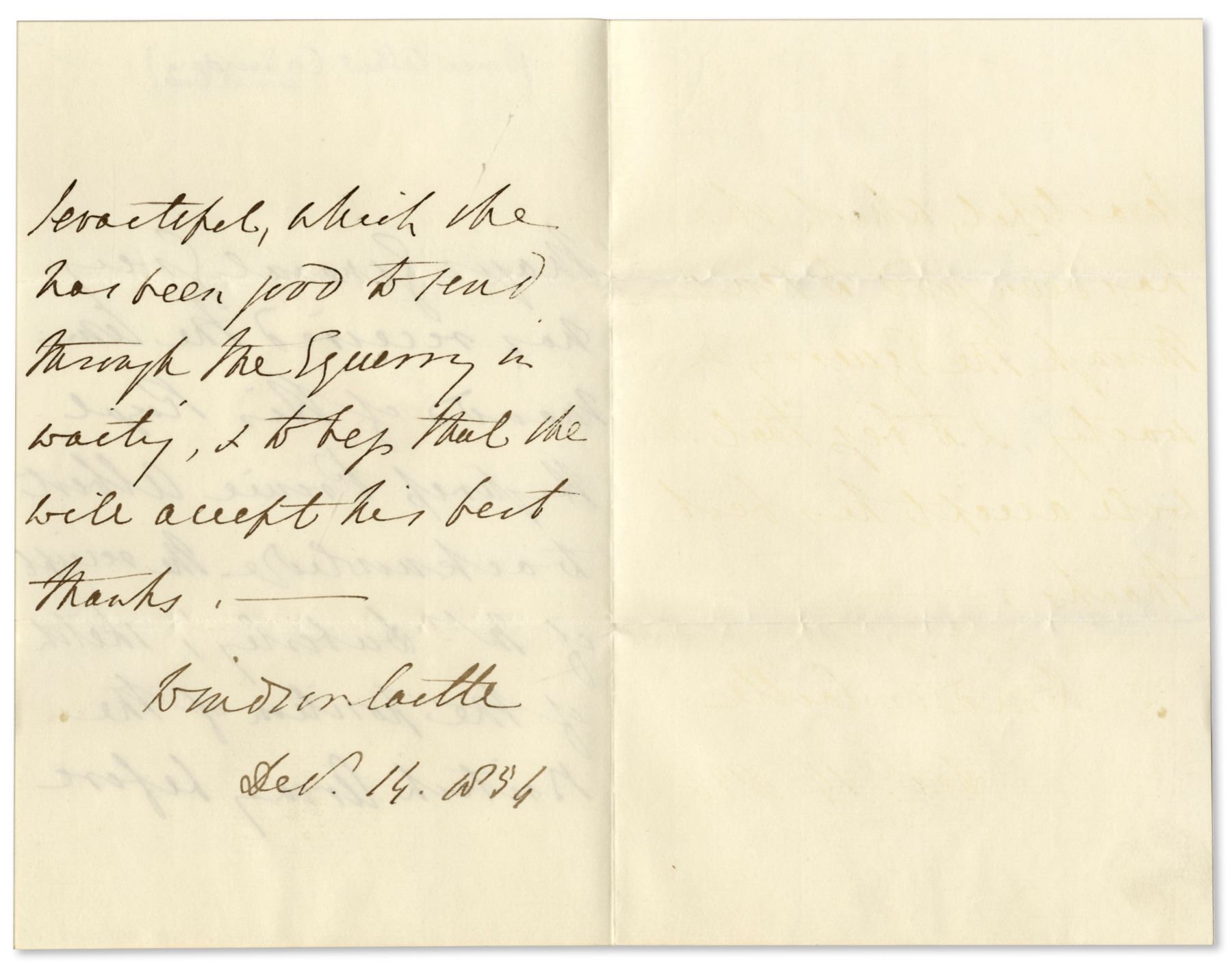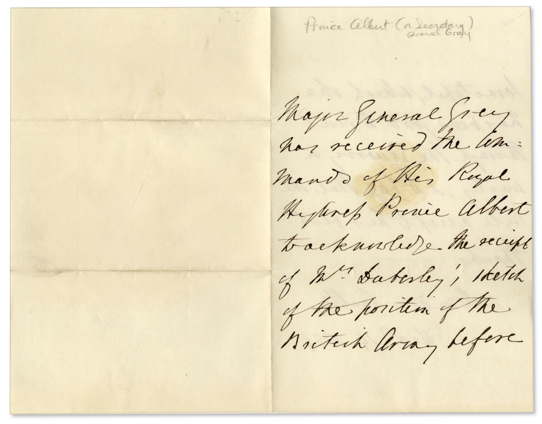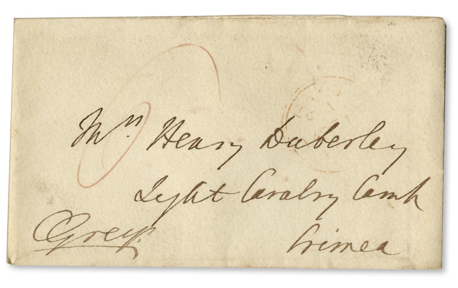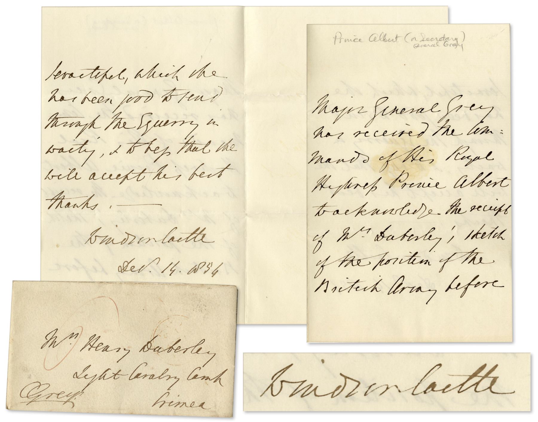Handwritten letter signed by the secretary of either Prince Albert or General Grey to Fanny Duberley, the most famous woman in the Crimea during the Crimean War. Dated 14 December 1854 and with its original envelope, the letter reads: ''Major General Grey has received the Command of His Royal Highness Prince Albert to acknowledge the receipt of Mrs. Duberley's sketch of the portion of the British Army before Sevastopol, which she has been good to send...'' Fanny Duberley was an unusually dedicated Captain's wife who witnessed the Charge of the Light Brigade at the Battle of Balaclava, which occurred a few months before this letter. 2pp. letter on card style stationery measures 4.5'' x 7''. Pencil notation near top edge and a stain to the first page. Very good condition.