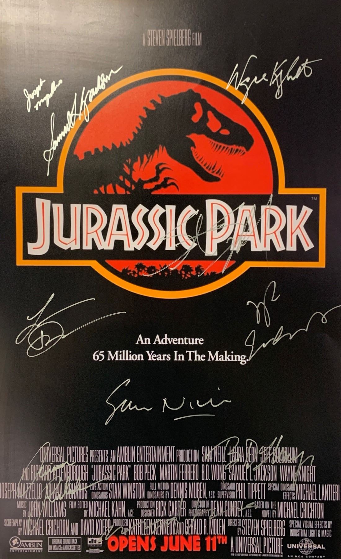 Autograph Includes: Sam Neill, Laura Dern, Jeff Goldblum, Joseph Mazzello, Ariana Richards, Samuel L jackson, Wayne Knight, BD Wong, Miguel Sandoval, Steven Spielberg