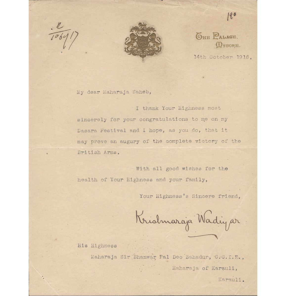 Autograph of Krishnaraja Wadiyar, Mysore Kingdom, 14th October 1916, extremely fine condition, Extremely Rare.Letter sent by the Maharaja of Mysore on the original letter head of"The Palace,Mysore" which has the royal coat of arms made of gold glitters. Letter was sent to the"Maharaja Sir Bhanwar Pal Deo Bahadur" of Karauli. The message in the letter briefly says about the celebrations of the most joyous festival of the Kingdom i.e. Dasara Festival.Lovely collectible for the Karnataka people.