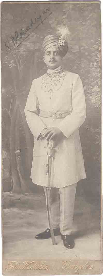 Autograph ofKrishnaraja Wadiyar, Mysore Kingdom,on his photograph,extremely fine condition, VeryRare.An important point to notice here is that Maharaja has signed only with the initials of his first name on this small photograph thinking of the space it would occupy on it. His autograph here reads as "K. Wadiyar".Important autograph because of the different style, great collectible for the Karnataka people.