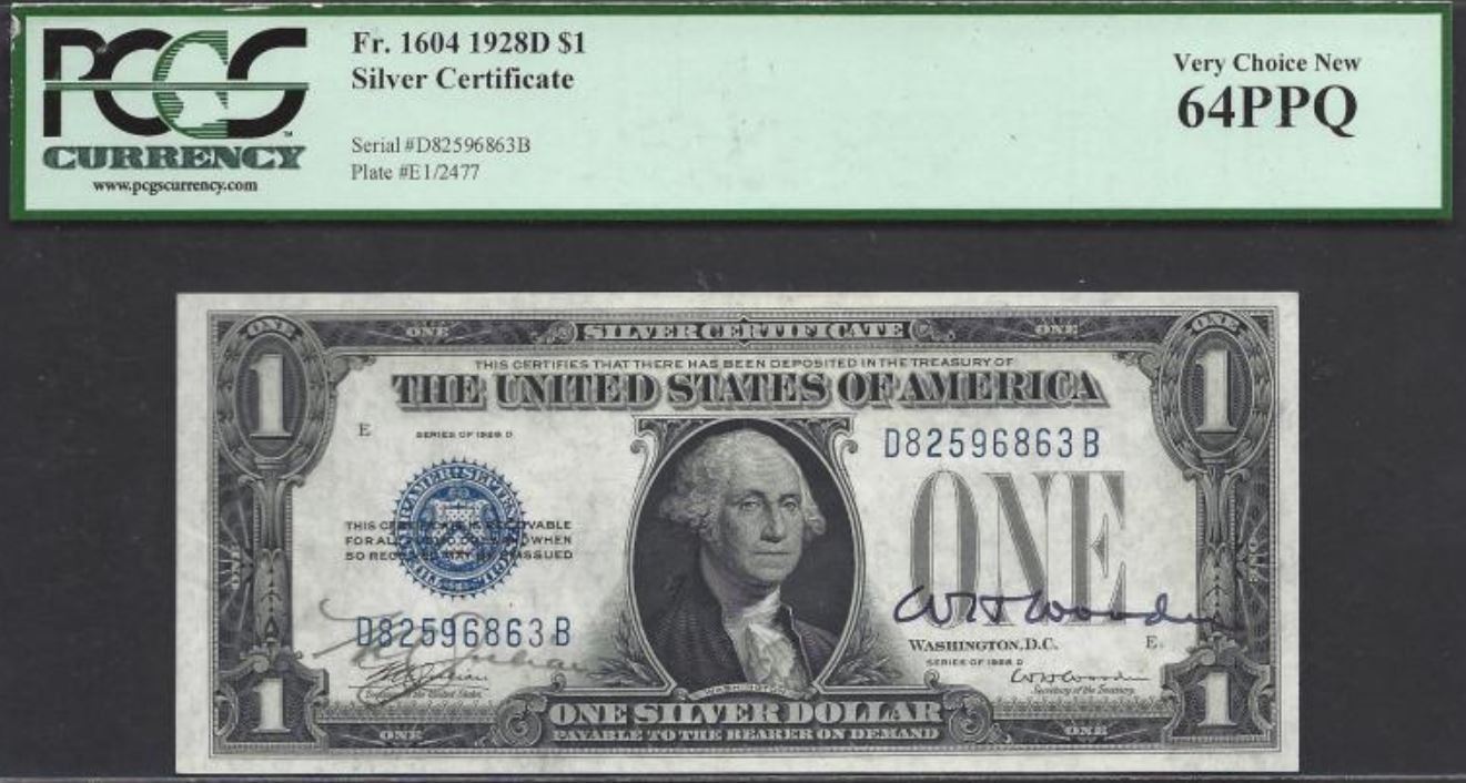 One Autographed 1928D $1 Silver Certificate PCGS 64PPQ. Autographed by Julian-Woodin. Very Rare!