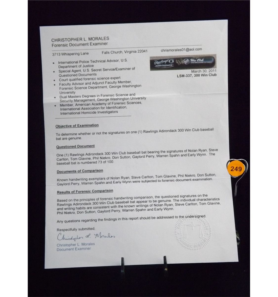 Autographed 300 Win Club Baseball Bat. Adirondack 300 Win Edition Bat. Autographs by Nolan Ryan, Steve Carlton, Tom Glavine, Phil Niekro, Don Sutton, Gaylord Perry, Wayne Spahn and Early Wynn. Appraised or estimated retail value $4800. COA by Christopher Morales. All Sales Final. Please see terms and conditions of auction.