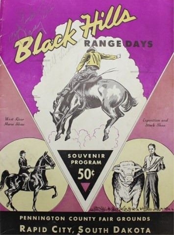 1953 program for the Black Hills Range Days Rapid City SD. Inside front page dedicated to early cowboy Russ Madison who furnished all of the stock for various rodeos throughout the area including Belle Fourche Roundup and Days of 76'. Remains very good both signatures on front cover, many great regional advertisements.