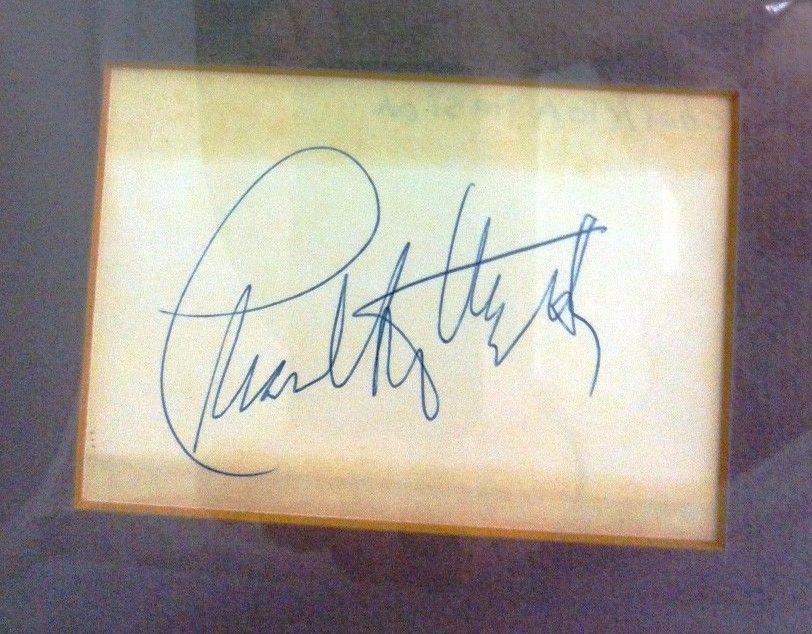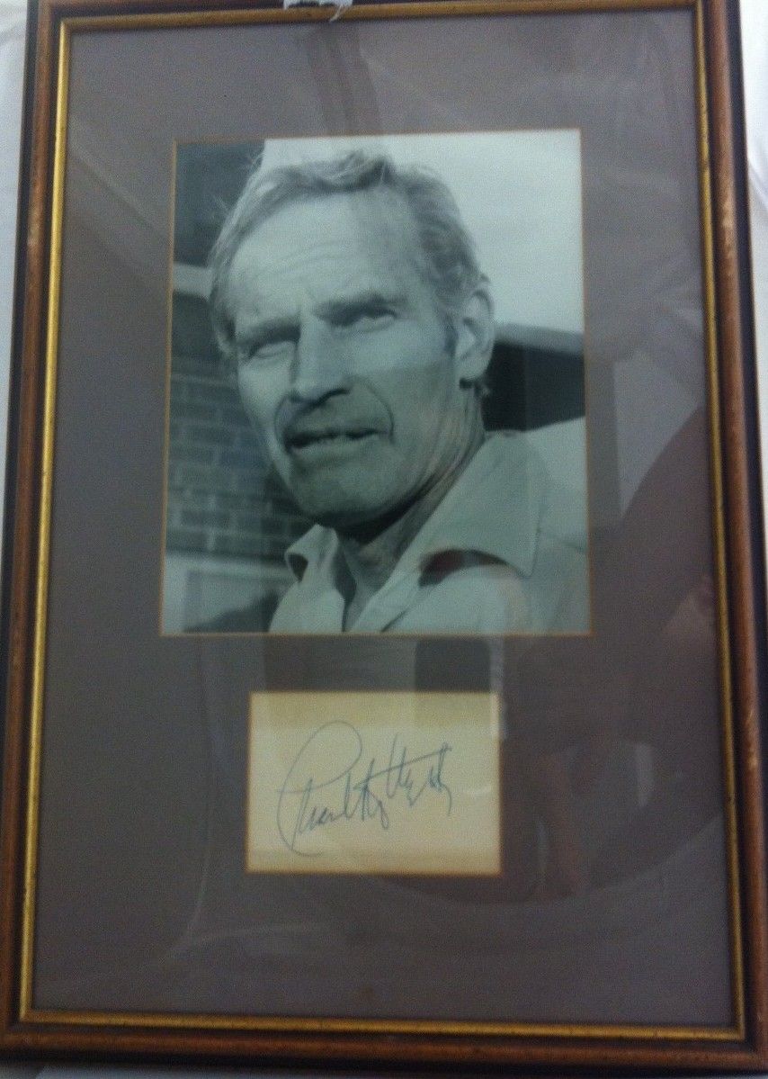 Framed and autographed photograph of Charleton Heston. COA on back certified authenticity by Heroes and Legends. Some discoloration from age and scratches in frame but otherwise in good condition. 18"H x 13"W.