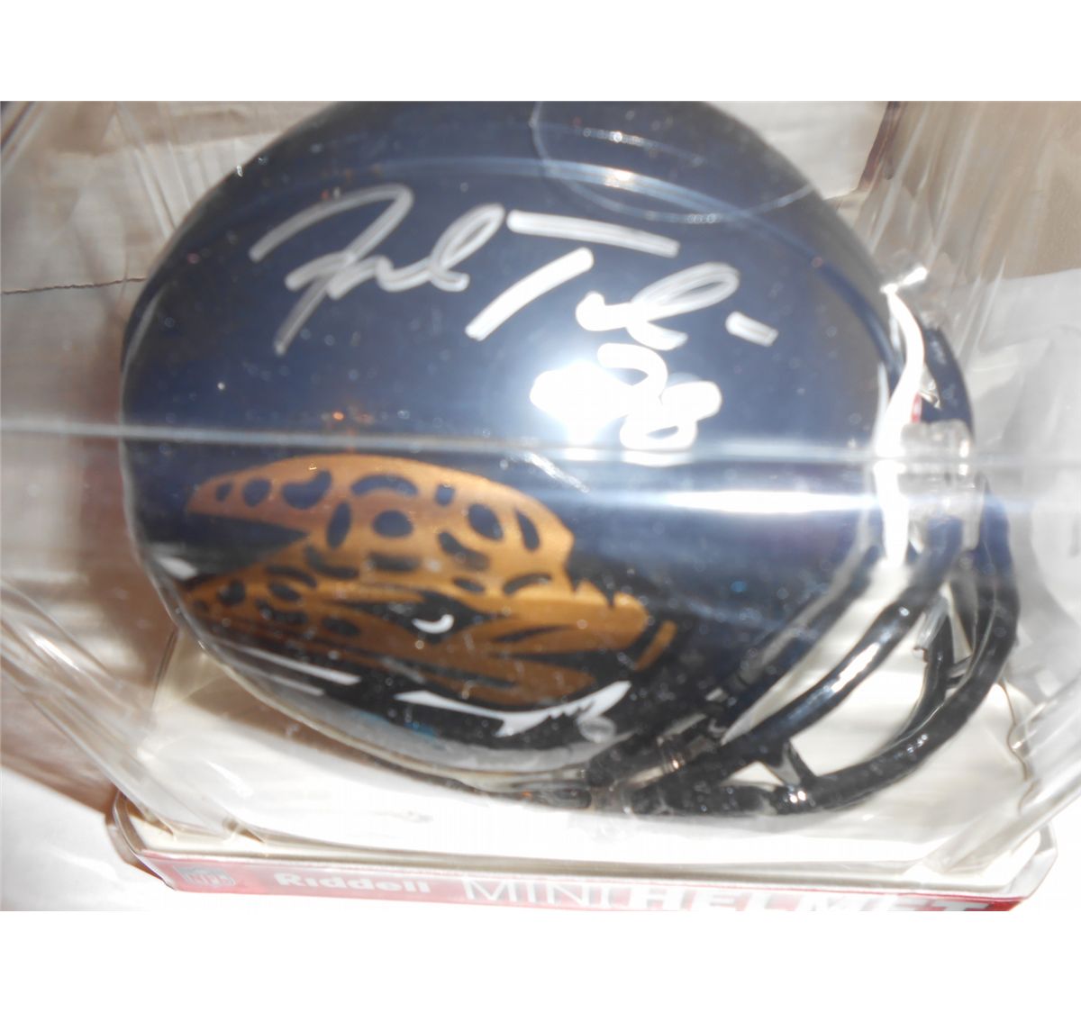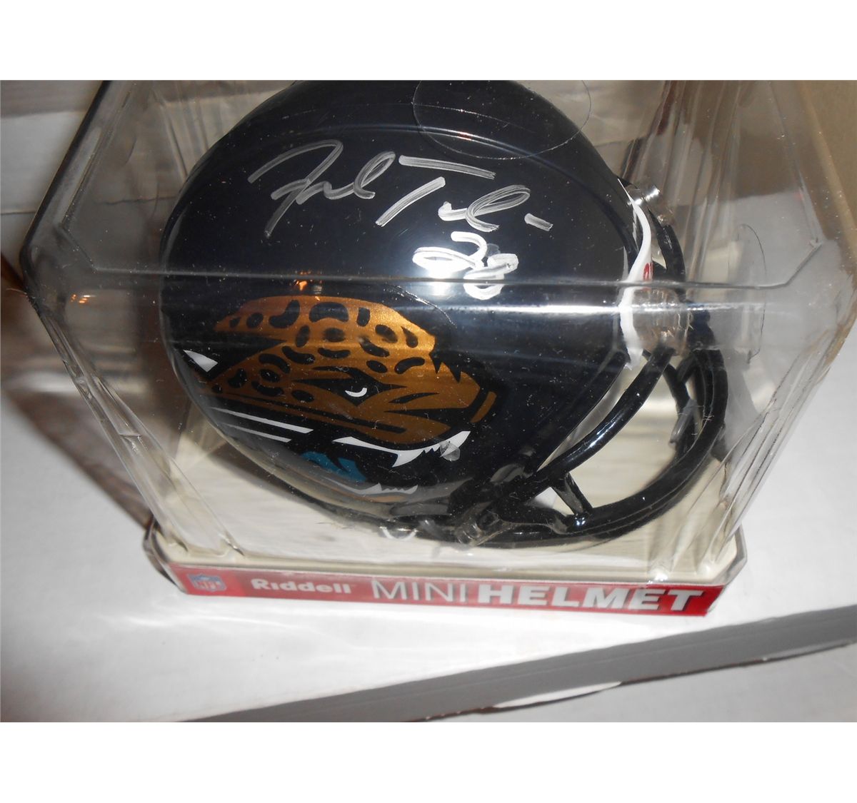 Autographed Fred Taylor Jacksonville Jaguars Riddell Mini Helmet. This Mini Helmet is signed in Silver Sharpee. This Autographed Mini Helmet is guaranteed to be authentic, and comes with a 100% money back guarantee on the authenticity of the signature.