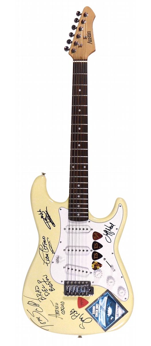 Autographed Guitar, Boston, signed by Brad Delp (deceased,) Antonio Cosmo, Fran Cosmo, Tom Scholz, Kimberley Dahme, Jeff Neal, Gary Phil on Austin Strat w/Sound Check pass & 5 picks, signatures obtained in person by Steve Pilchen Des Moines, IA 2003, Exc cond, 39"L.