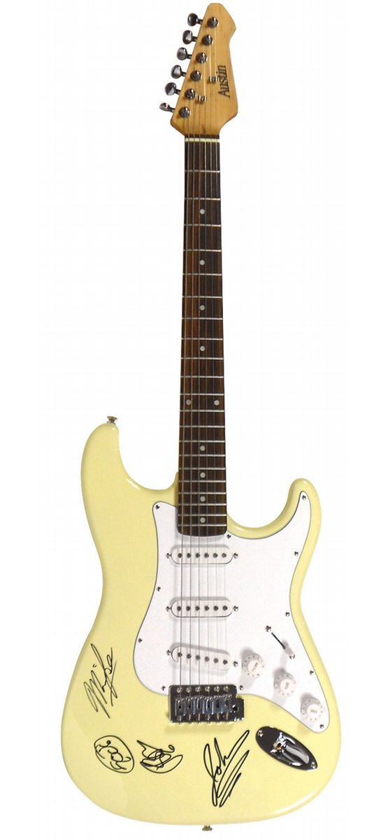 Autographed Guitar, Goo Goo Dolls, signed by John Rzeznik, Robby Takac, Mike Malinin on Austin Strat, signatures obtained in person by Steve Pilchen Clive, IA 2010, Exc cond, 39"L.