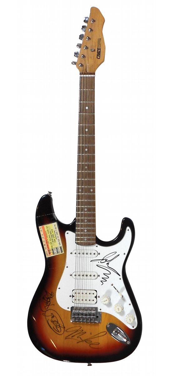 Autographed Guitar, Goo Goo Dolls, signed by Mike Malinin, John Rzeznik, Robby Takac on Crate Electra w/event ticket, signatures obtained in person by Steve Pilchen in Des Moines, IA 1999, Exc cond, 39"L.