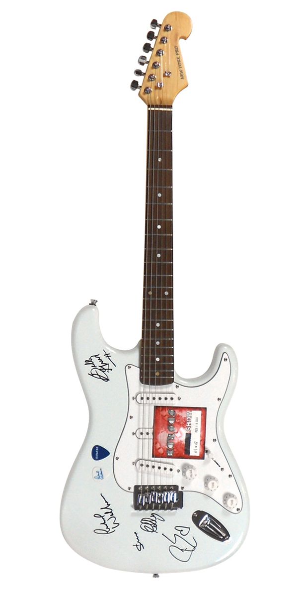Autographed Guitar, Kansas, signed by Rich Williams, Steve Walsh, Phil Ehart, Billy Greer, Robby Steinhardt on New York Pro w/M&G pass & 2 picks, signatures obtained in person by Steve Pilchen Waterloo, IA 2003, Exc cond, 39"L.