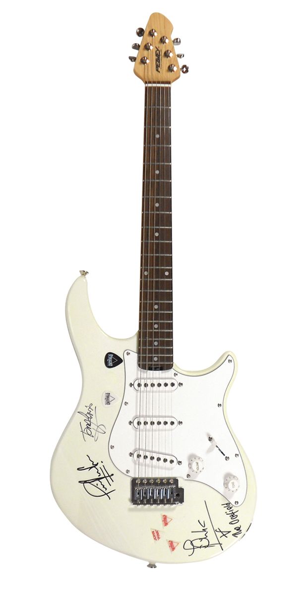 Autographed Guitar, The Outfield, signed by Tony Lewis, John Spinks, Alan Jackman on Peavey Raptor Plus w/5 picks, signatures obtained in person by Steve Pilchen, Exc cond, 37"L.