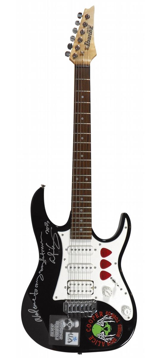 Autographed Guitar, signed by Alice Cooper & inscribed "Welcome to my nightmare" on Gio Ibanez w/VIP pass, 3 picks & tour sticker, signature obtained in person by Steve Pilchen in Clear Lake, IA 2003, Exc cond, 39"L.