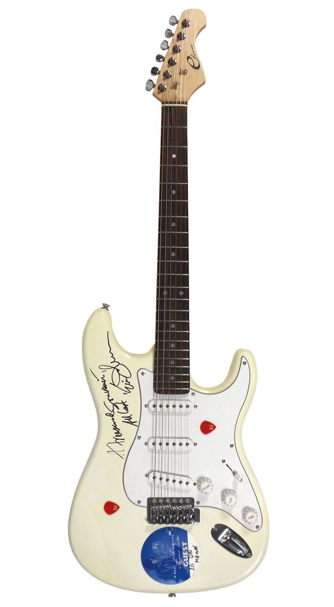 Autographed Guitar, signed by Eric Johnson & inscribed "A treasured souvenir... All the best" on Eleca Strat w/Guest pass & 2 picks, signature obtained in person by Steve Pilchen Des Moines, IA 2003, Exc cond, 39"L.