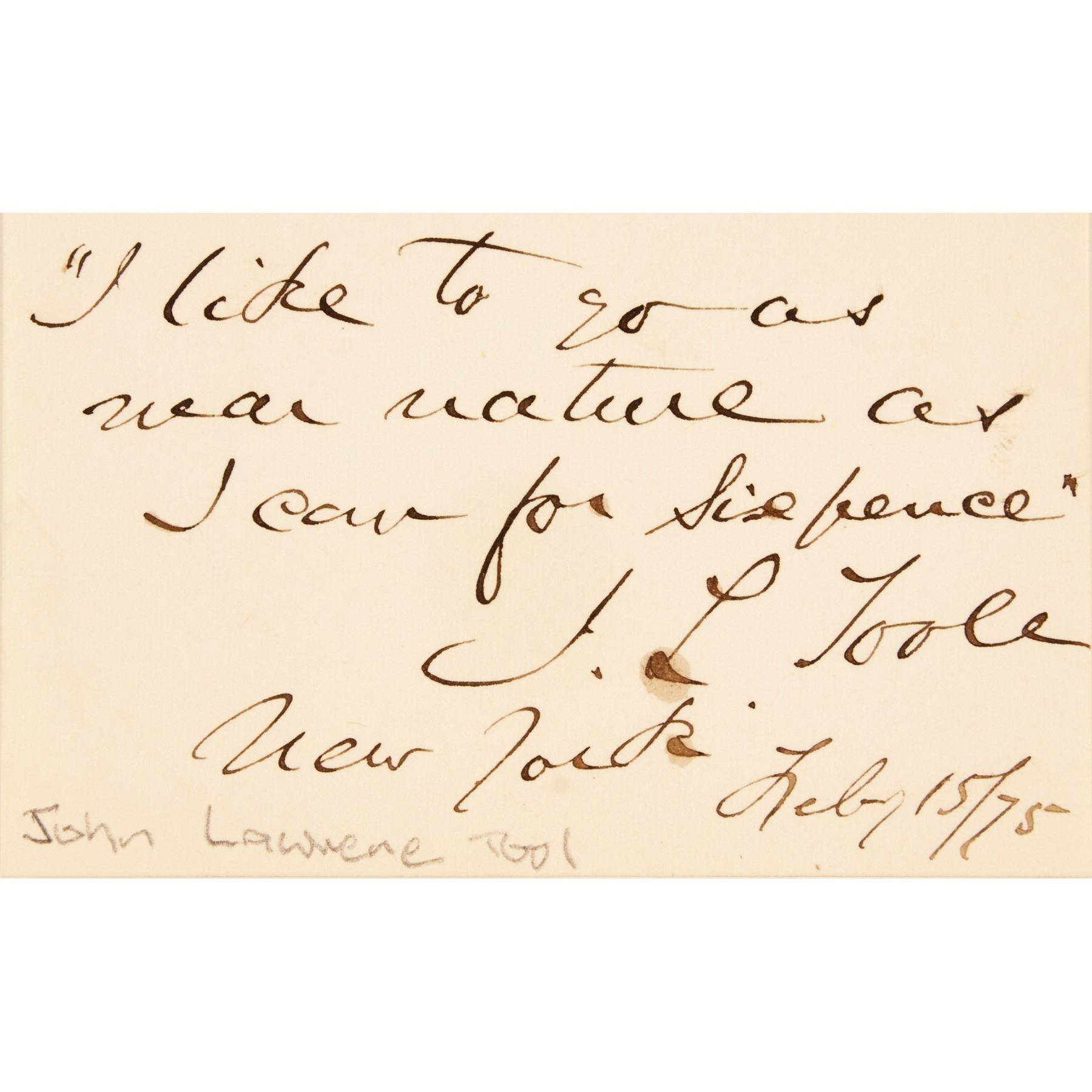 Inscription and Signed, “I like to go as near nature as I can for Six pence - J. L. Toole, New York Feb 15/75” boldly written on Card, measuring “3.25” x 2” Choice Crisp Mint. Trace of prior mount on blank reverse. Two trivial ink spots. John Lawrence (J. L.) Toole was famous for his roles in farce and in serio-comic melodramas in a career that spanned more than four decades. He was so famous in his day that he was the first actor to have a West End theatre named after him.