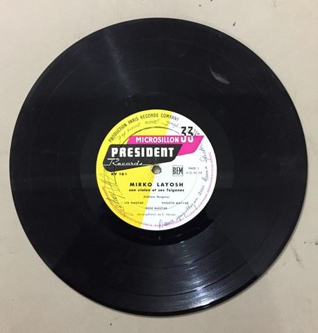 Mirko Layosh, Son Violon Et Ses Tziganes album, "Joue... Tziggane... Joue", autographed by Henry Kaston on the front cover, various autographs written on vinyl record, mastered at President Records, 7 songs between the 2 sides of the record include "Hanna Ahroni"; "Ray Massey"; "Renato"; album cover shows Mirko Layosh standing on top of a violin with blue, red, and yellow flames surrounding him