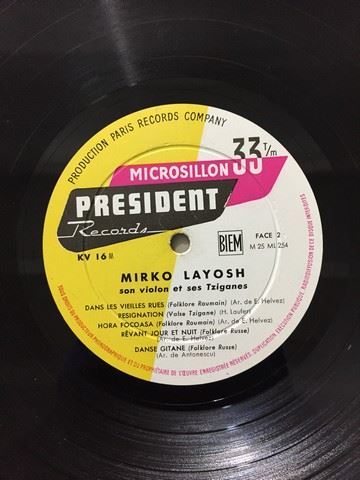 Mirko Layosh, Son Violon Et Ses Tziganes album, "Joue... Tziggane... Joue", autographed by Henry Kaston on the front cover, various autographs written on vinyl record, mastered at President Records, 7 songs between the 2 sides of the record include "Hanna Ahroni"; "Ray Massey"; "Renato"; album cover shows Mirko Layosh standing on top of a violin with blue, red, and yellow flames surrounding him