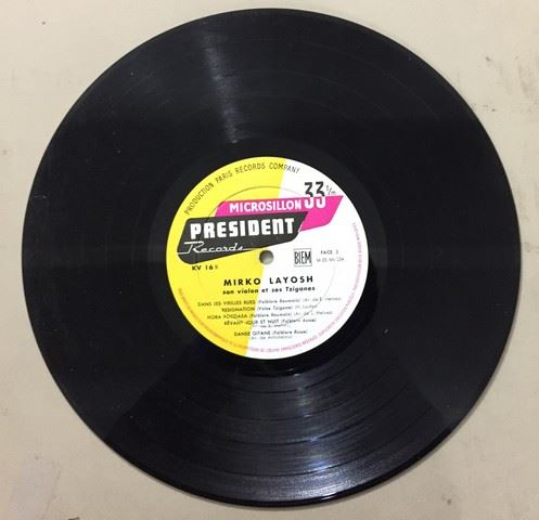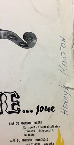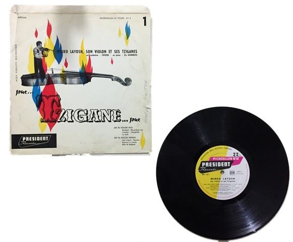 Mirko Layosh, Son Violon Et Ses Tziganes album, "Joue... Tziggane... Joue", autographed by Henry Kaston on the front cover, various autographs written on vinyl record, mastered at President Records, 7 songs between the 2 sides of the record include "Hanna Ahroni"; "Ray Massey"; "Renato"; album cover shows Mirko Layosh standing on top of a violin with blue, red, and yellow flames surrounding him