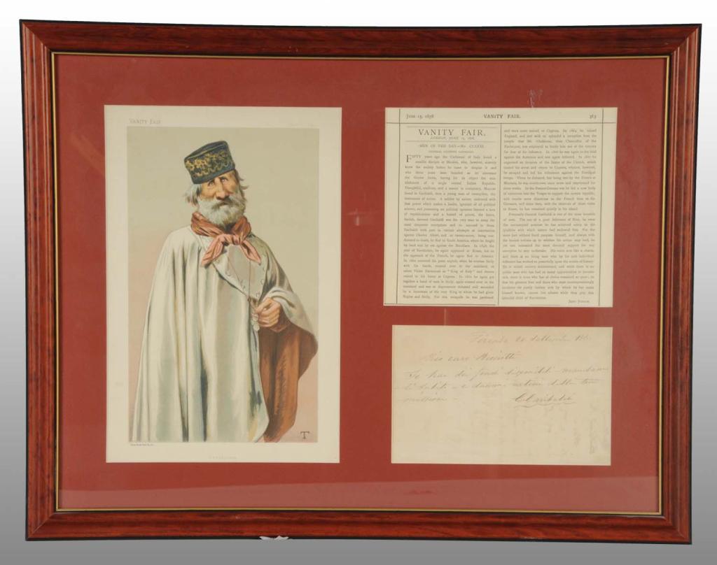 Description Includes Vanity Fair article with picture, dated 1878. Garibaldi was a well-known 19th century Italian military and political figure. Framed under glass. Condition (Excellent). Size Framed: 19 - 1/2" x 25".