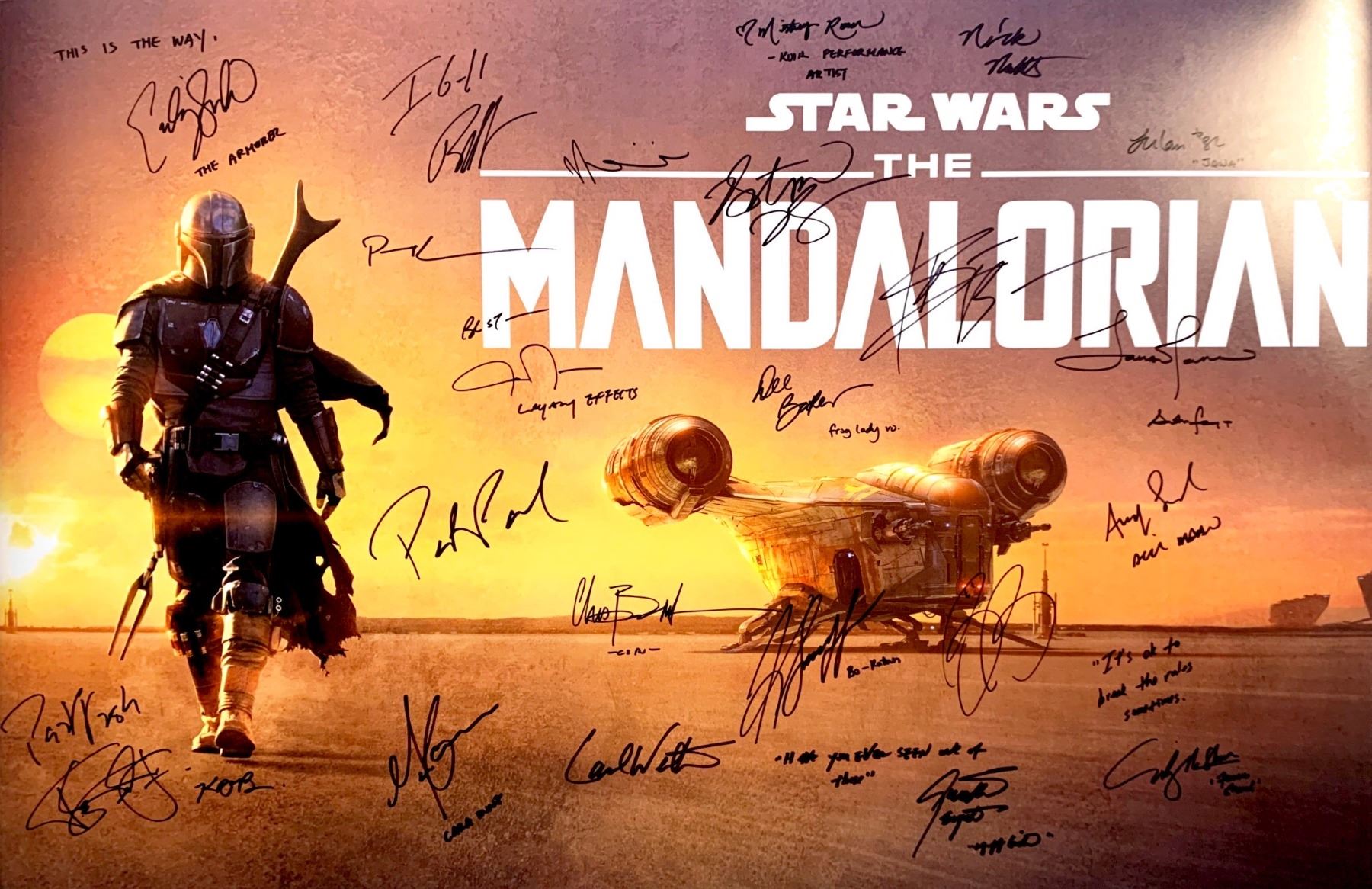 Autographed: Tait Fletcher, Emily Swallow, Katee Sackhoff, Temuera Morrison, Paul Sun-Hyung Lee, Gina Carano, Katy M. O'Brian, Ming-Na Wen, Dee Bradley Baker, Carl Weathers, Taika Waititi, Rio Hackford, Leilani Shiu, Sasha Banks, Misty Rosas, Nick Nolte, Bill Burr, Giancarlo Esposito, Horatio Sanz, Amy Sedaris, Chris Bartlett, Pedro Pascal